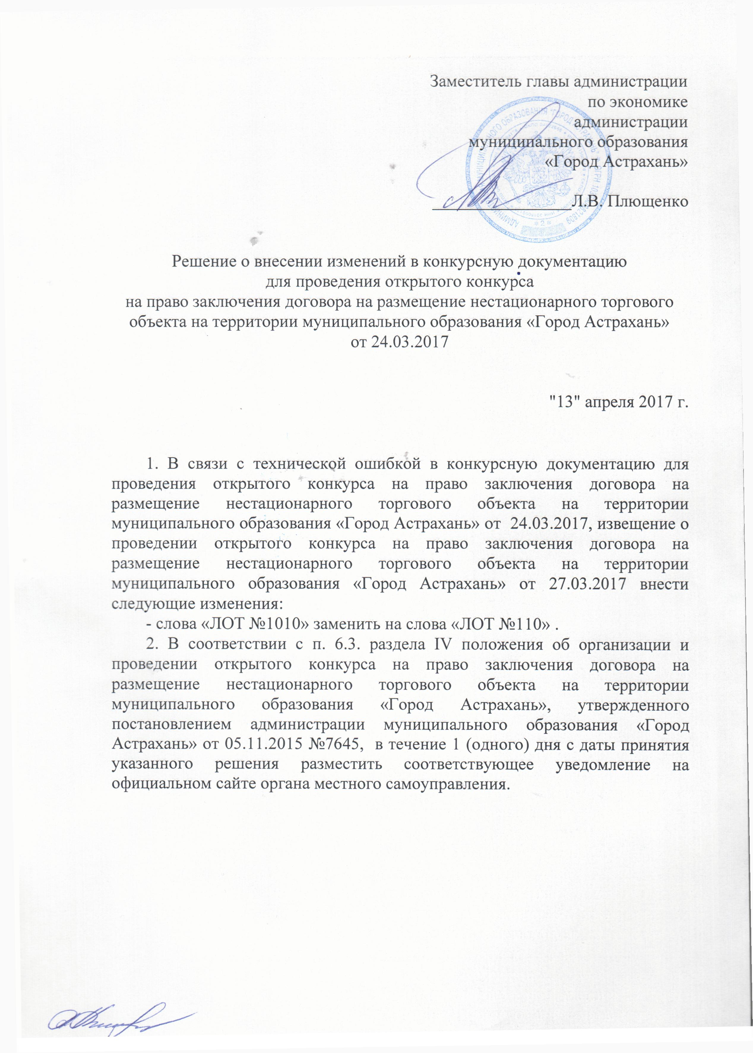 Главная » Решение от 13.04.2017 о внесении изменений в конкурсную документацию для проведения открытого конкурса на право заключения договора на размещение нестационарного торгового объекта на территории муниципального образования «Город Астрахань» от 24.03.2017