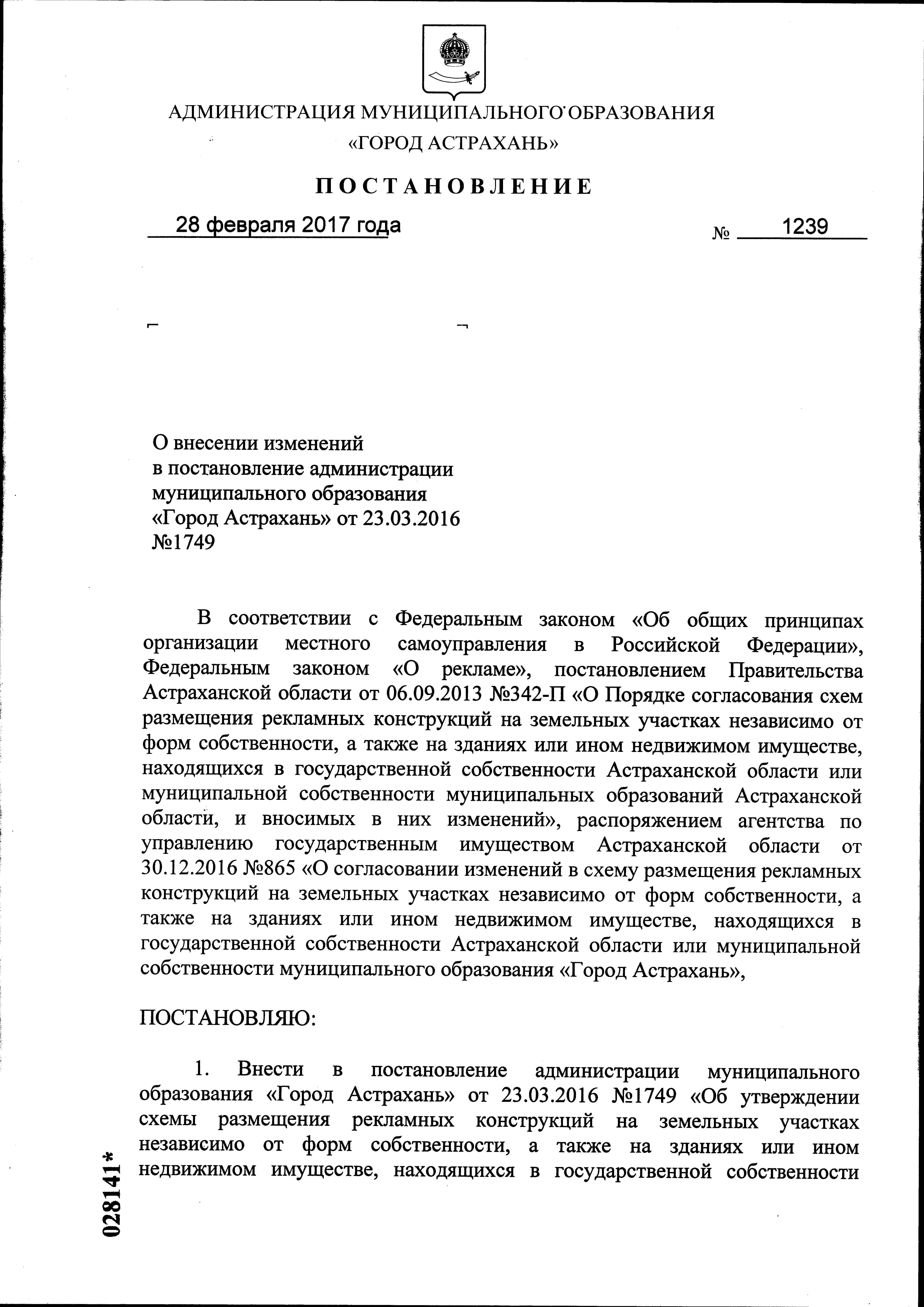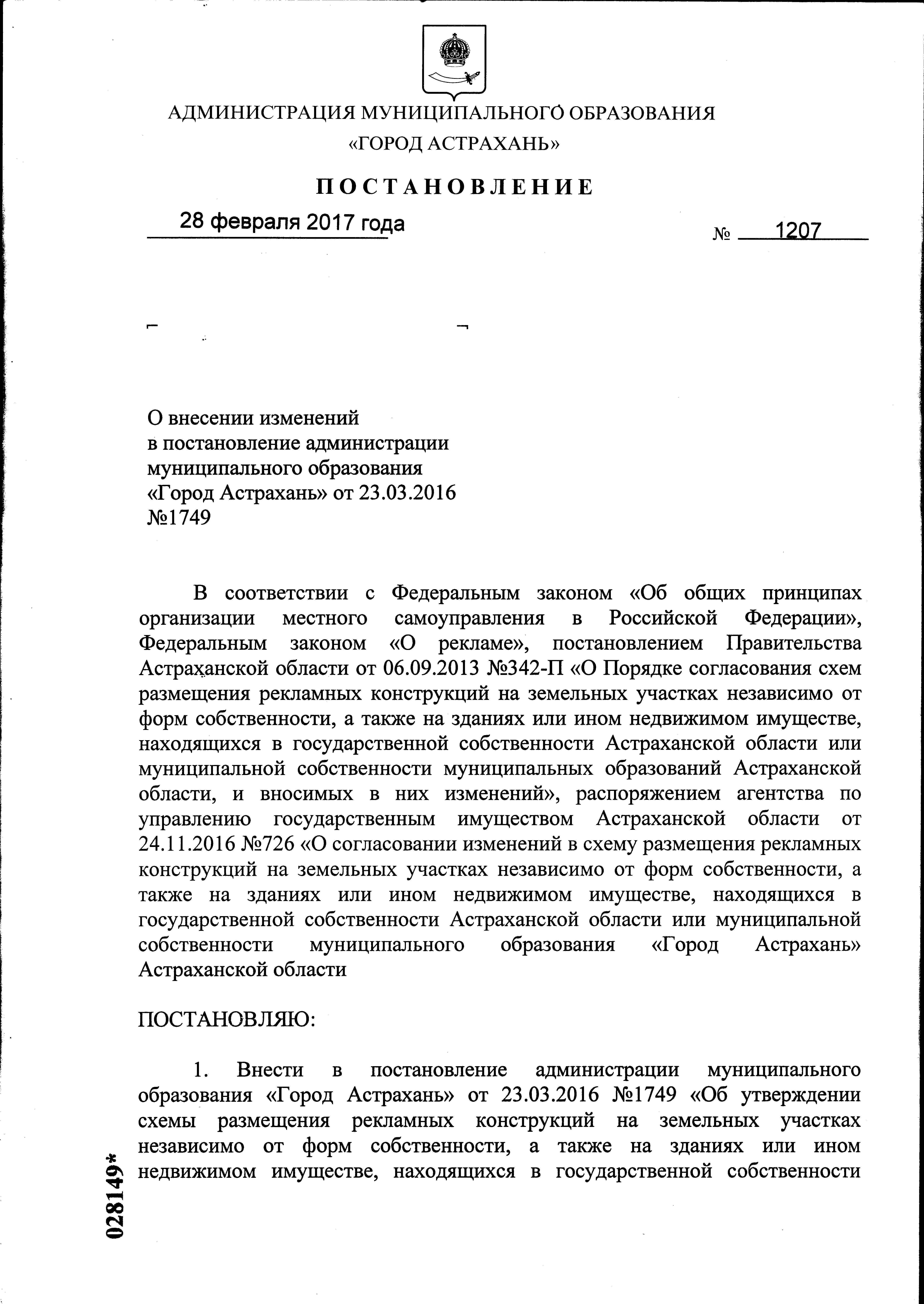 ПОСТАНОВЛЕНИЕ Администрации муниципального образования "Город Астрахань" 23 марта 2016 года № 1749 "Об утверждении схемы размещения рекламных конструкций на земельных участках независимо от форм собственности, а также на зданиях или ином недвижимом имуществе, находящихся в государственной собственности Астраханской области или муниципальной собственности муниципального образования "Город Астрахань" Астраханской области на территории Кировского района