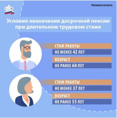 Федеральный закон от 03.10.2018 №350-ФЗ «О внесении изменений в отдельные законодательные акты Российской Федерации по вопросам назначения и выплаты пенсий» впервые вводит право на досрочную пенсию гражданам, имеющим длительный трудовой стаж. С 2019 года выйти на заслуженный отдых можно на два года раньше общепринятого пенсионного возраста для мужчин при стаже 42 года (но не ранее 60 лет), для женщин при стаже 37 лет (но не ранее 55 лет).