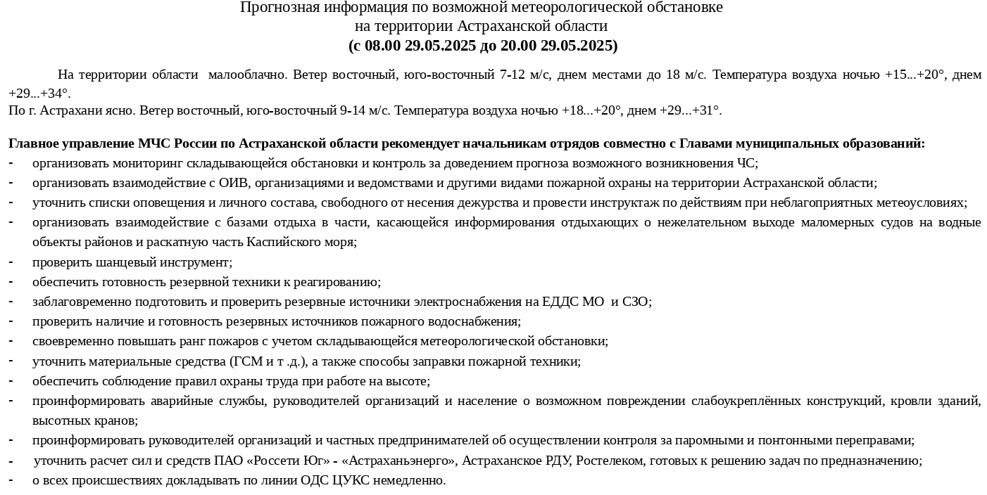 Краткосрочный прогноз возникновения и развития параметров ЧС на территории Астраханской области на 29.05-04.06.2025 г.