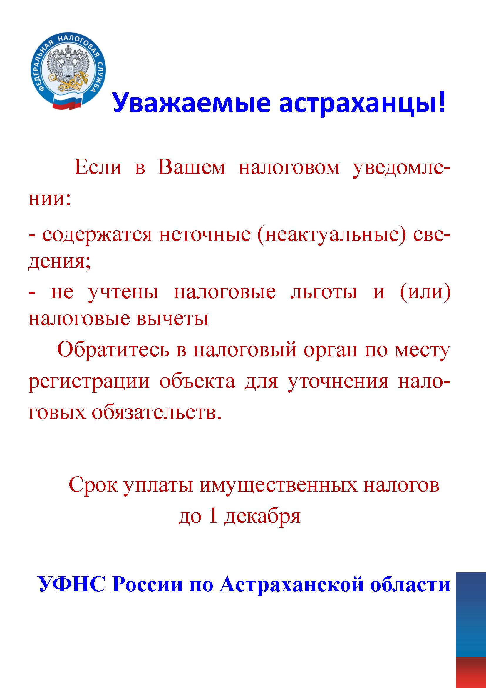 Управление ФНС России по Астраханской области приступило к рассылке налоговых уведомлений по имущественным налогам за 2016 год. В отдельных случаях по техническим причинам ошибочно проведено повторное начисление имущественных налогов за 2014-2015 годы. Если начисленные суммы Вами уплачены, то по прилагаемым квитанциям уплату следует произвести только за 2016 год.
