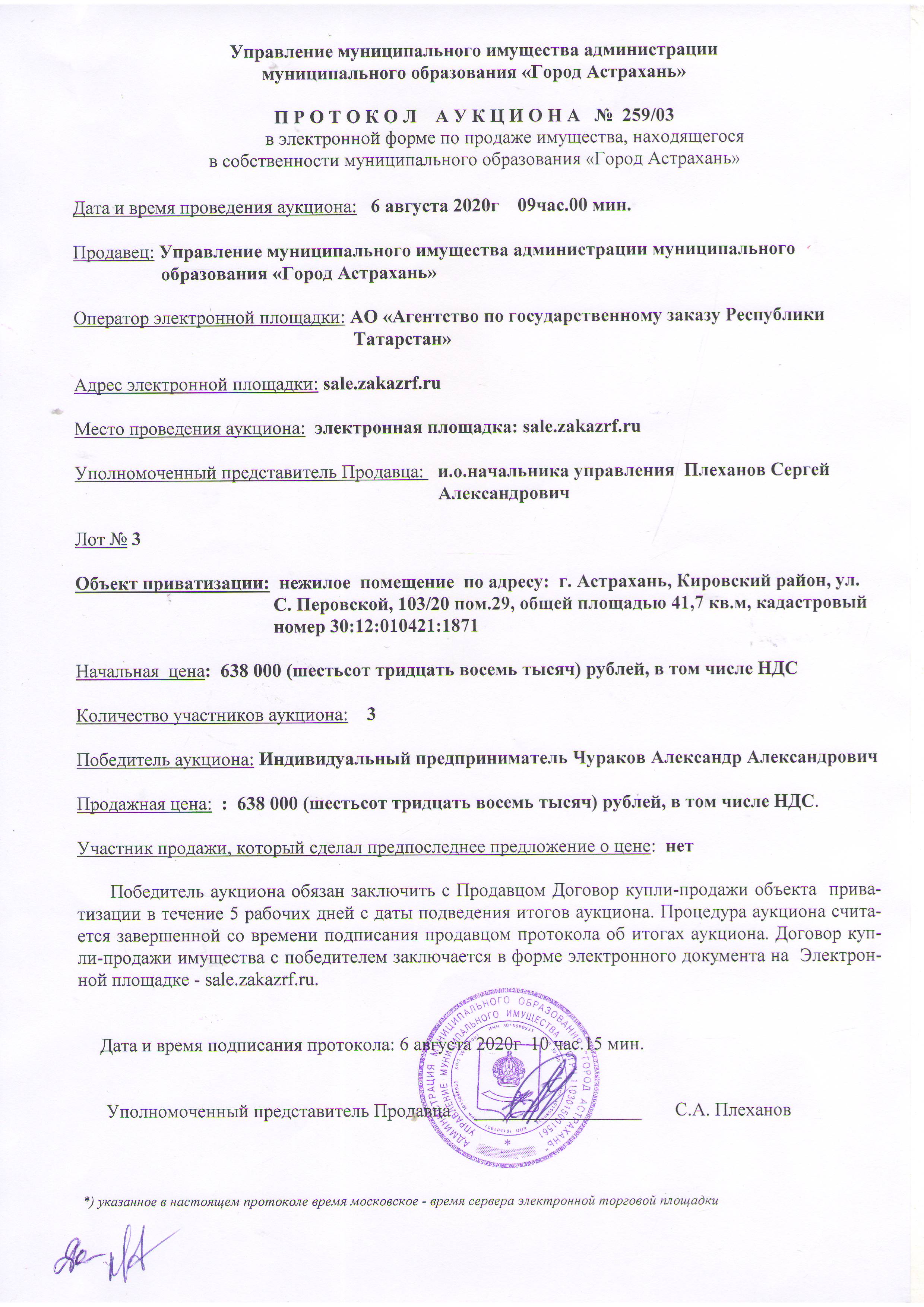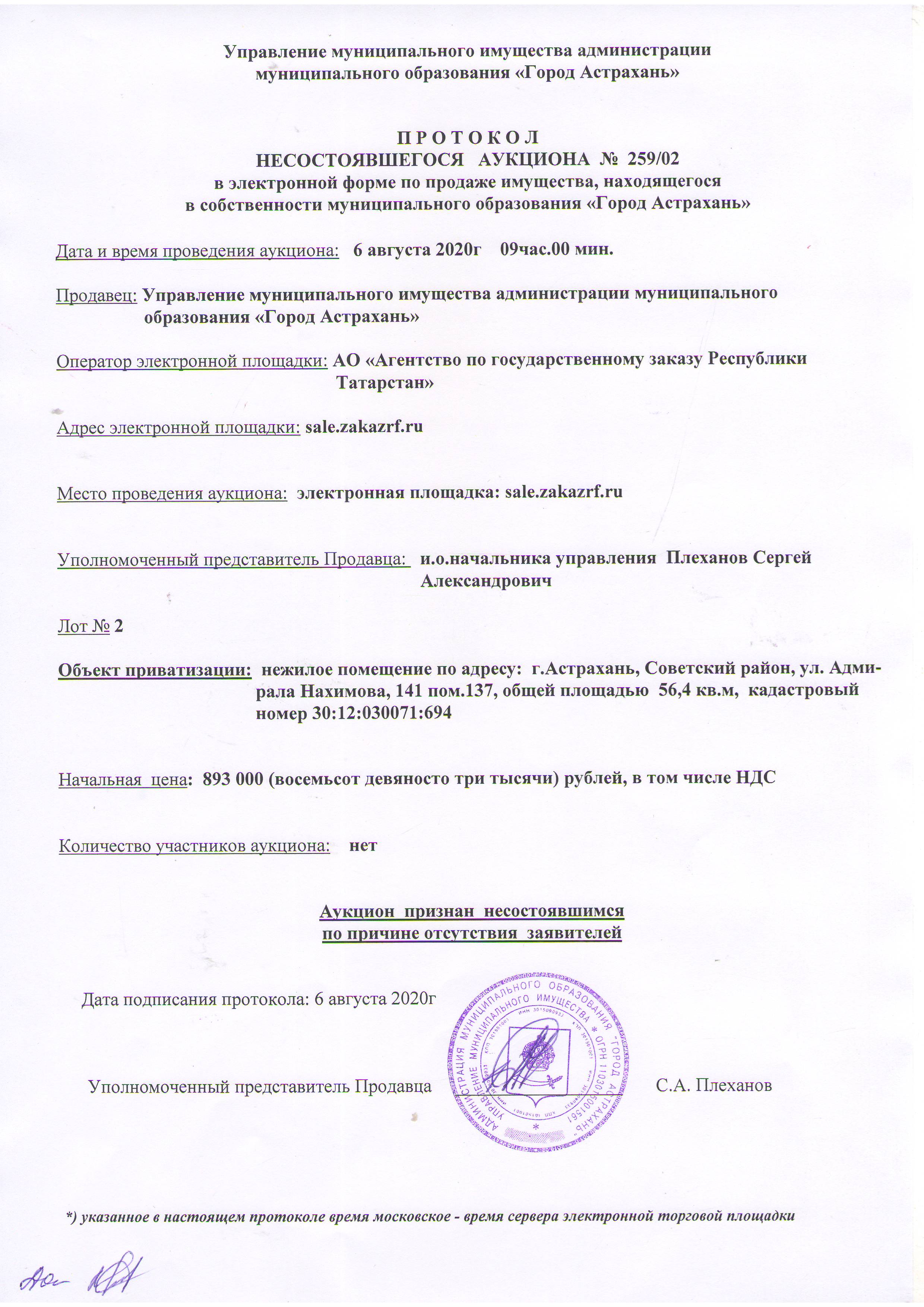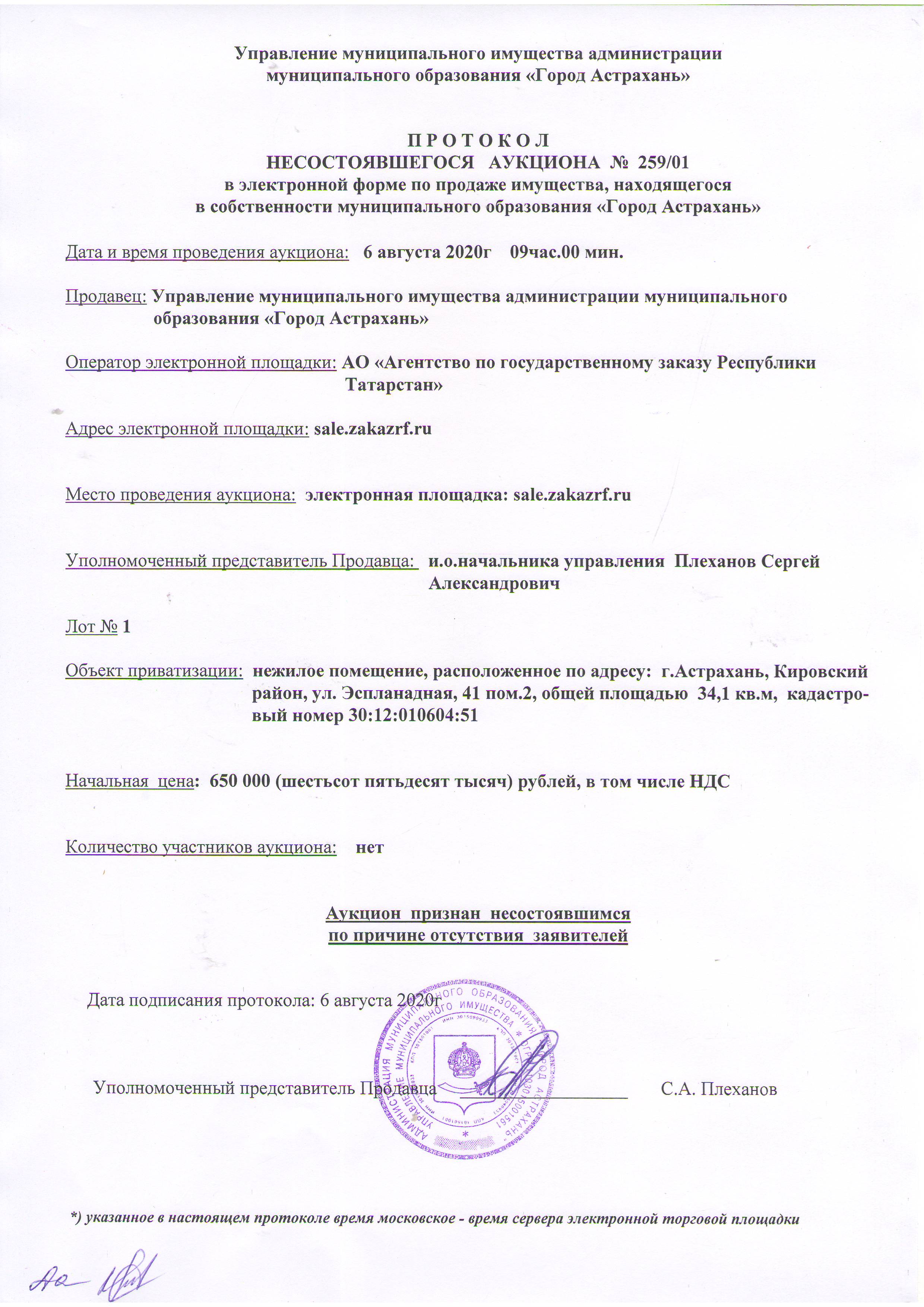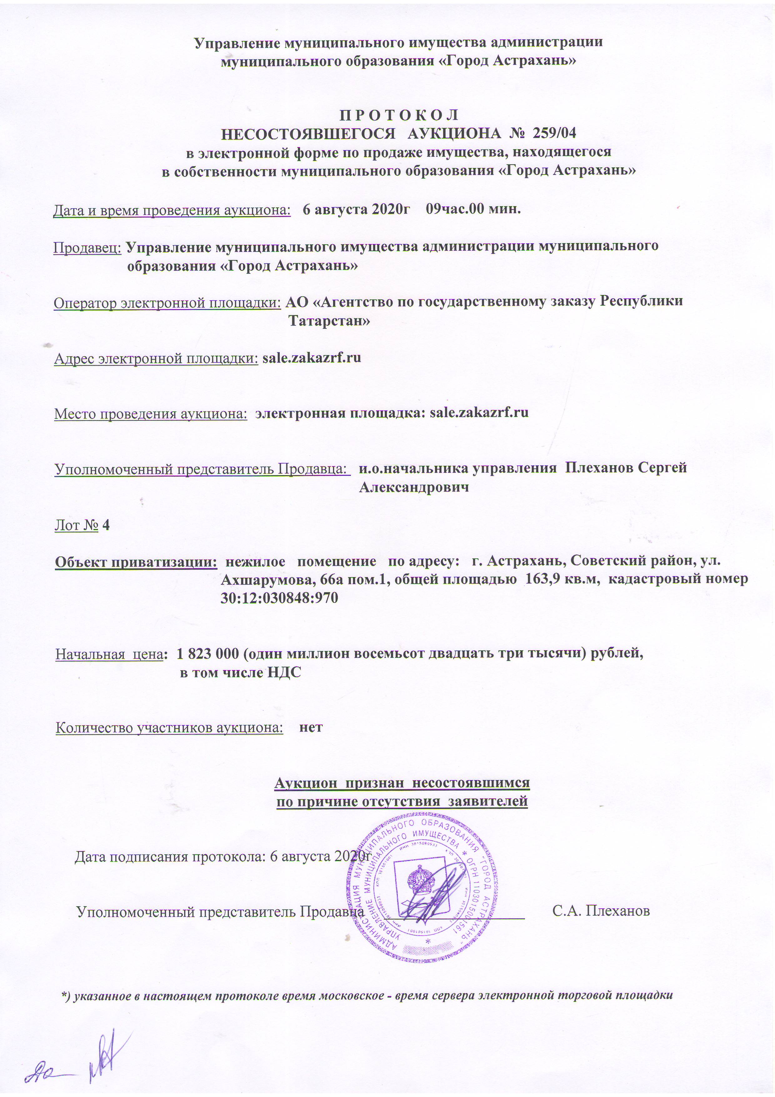 отчет об аукционе по продаже имущества, находящегося в собственности муниципального образования "Город Астрахань" 06.08.2020г