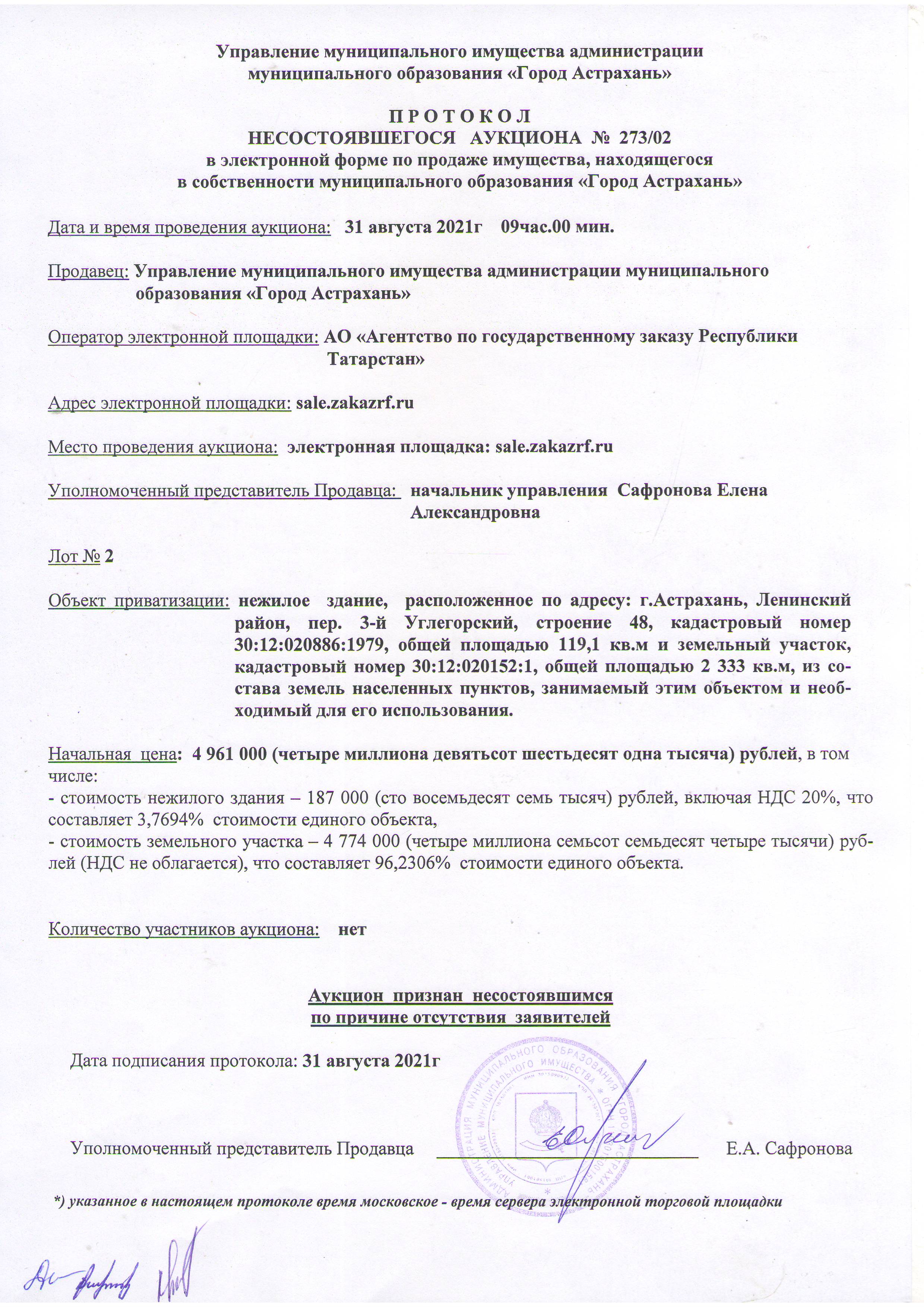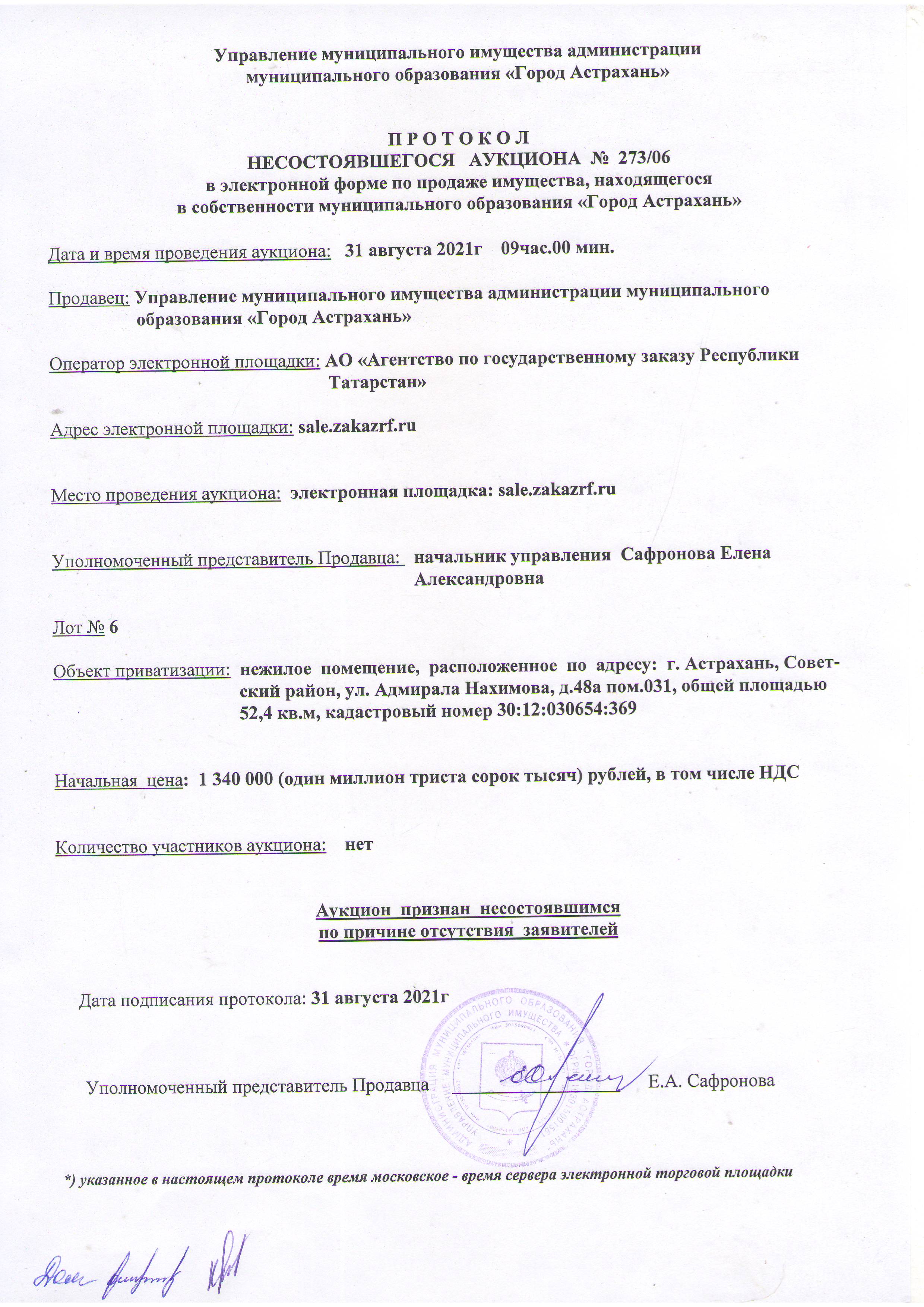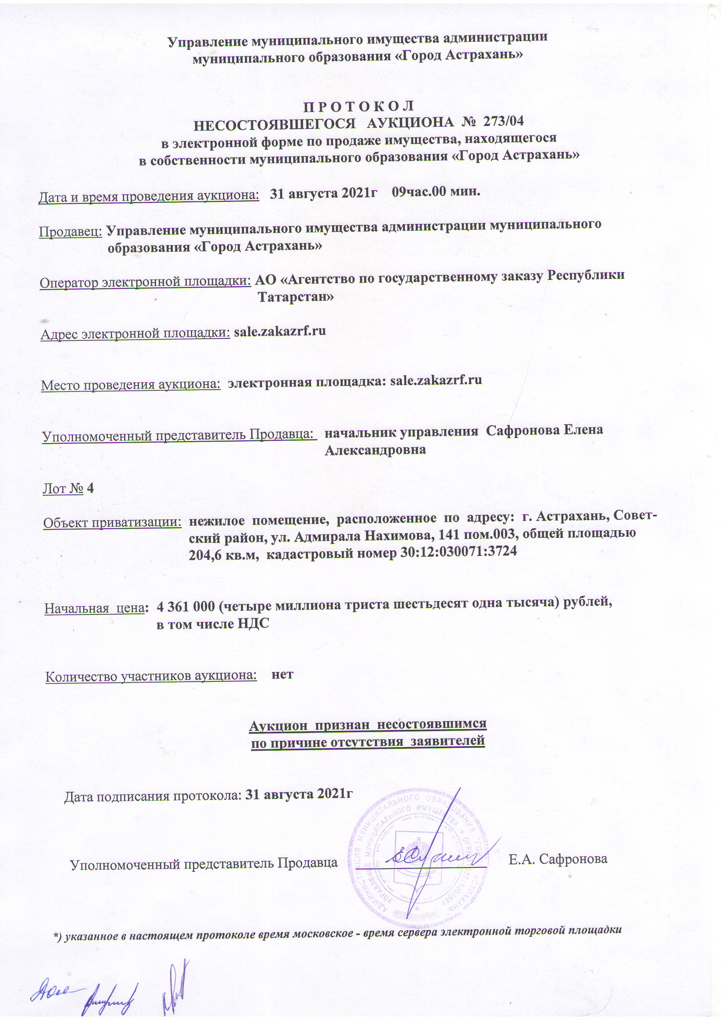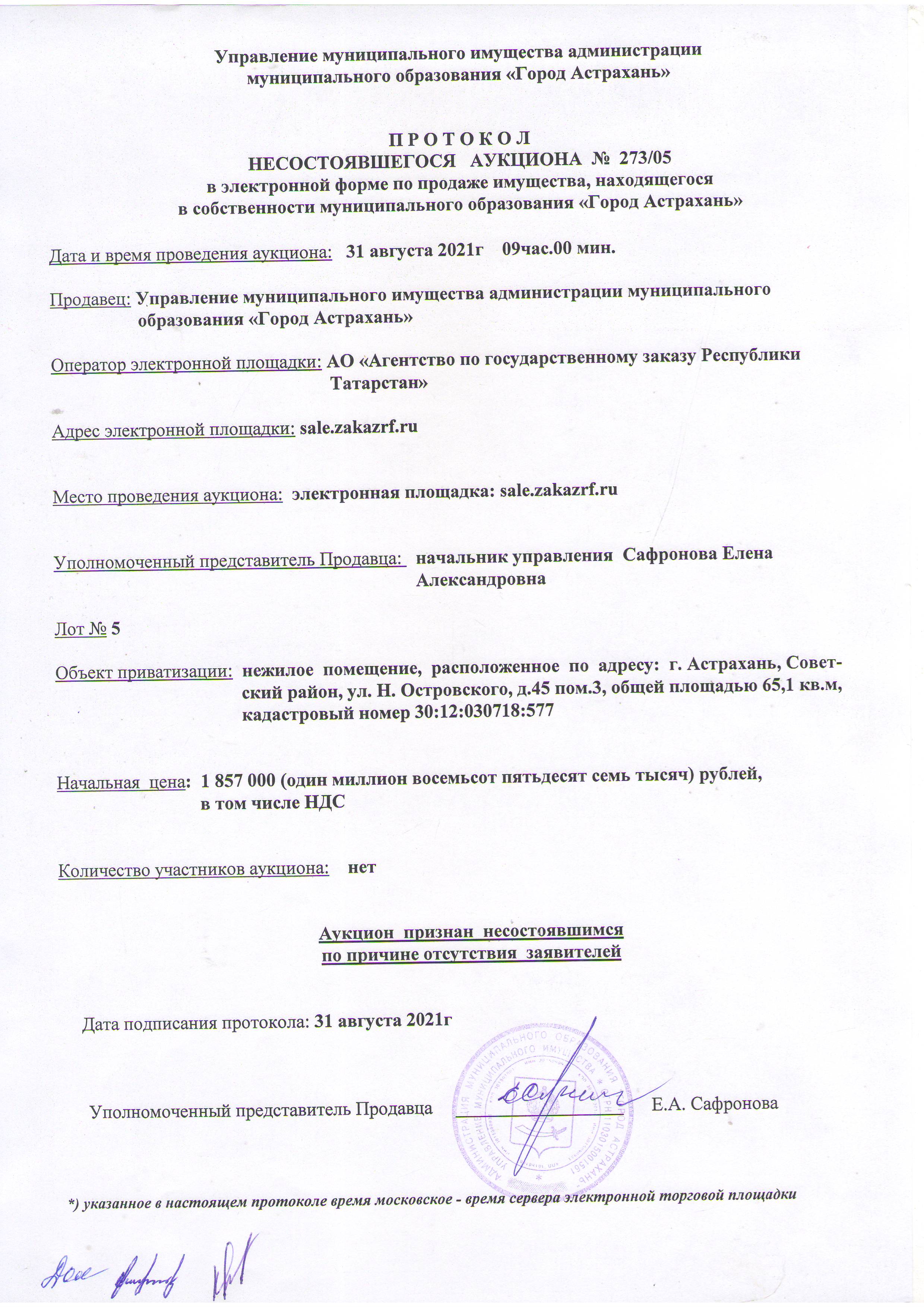 отчет об аукционе по продаже имущества , находящегося в собственности муниципального образования "Город Астрахань" 31.08.2021
