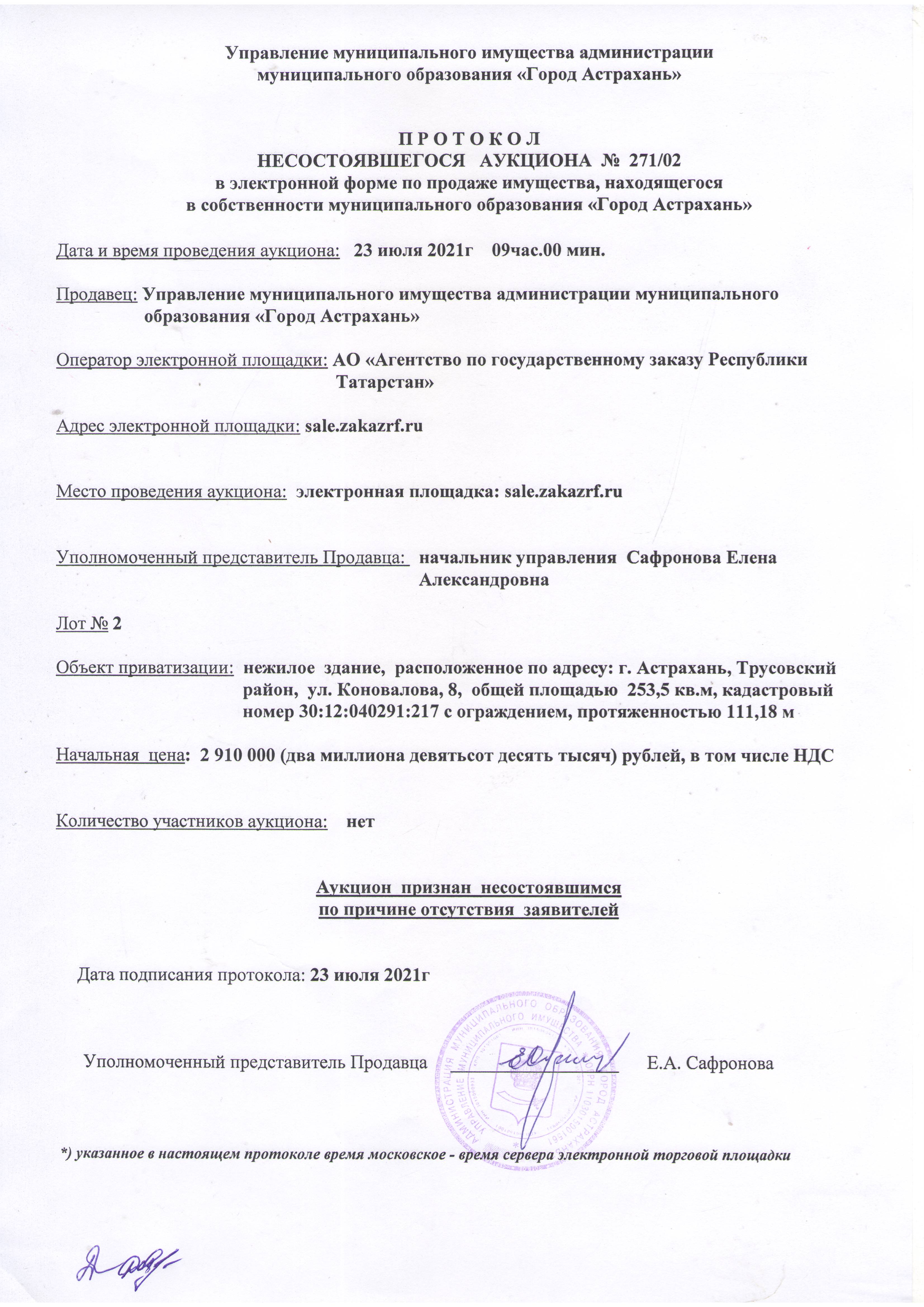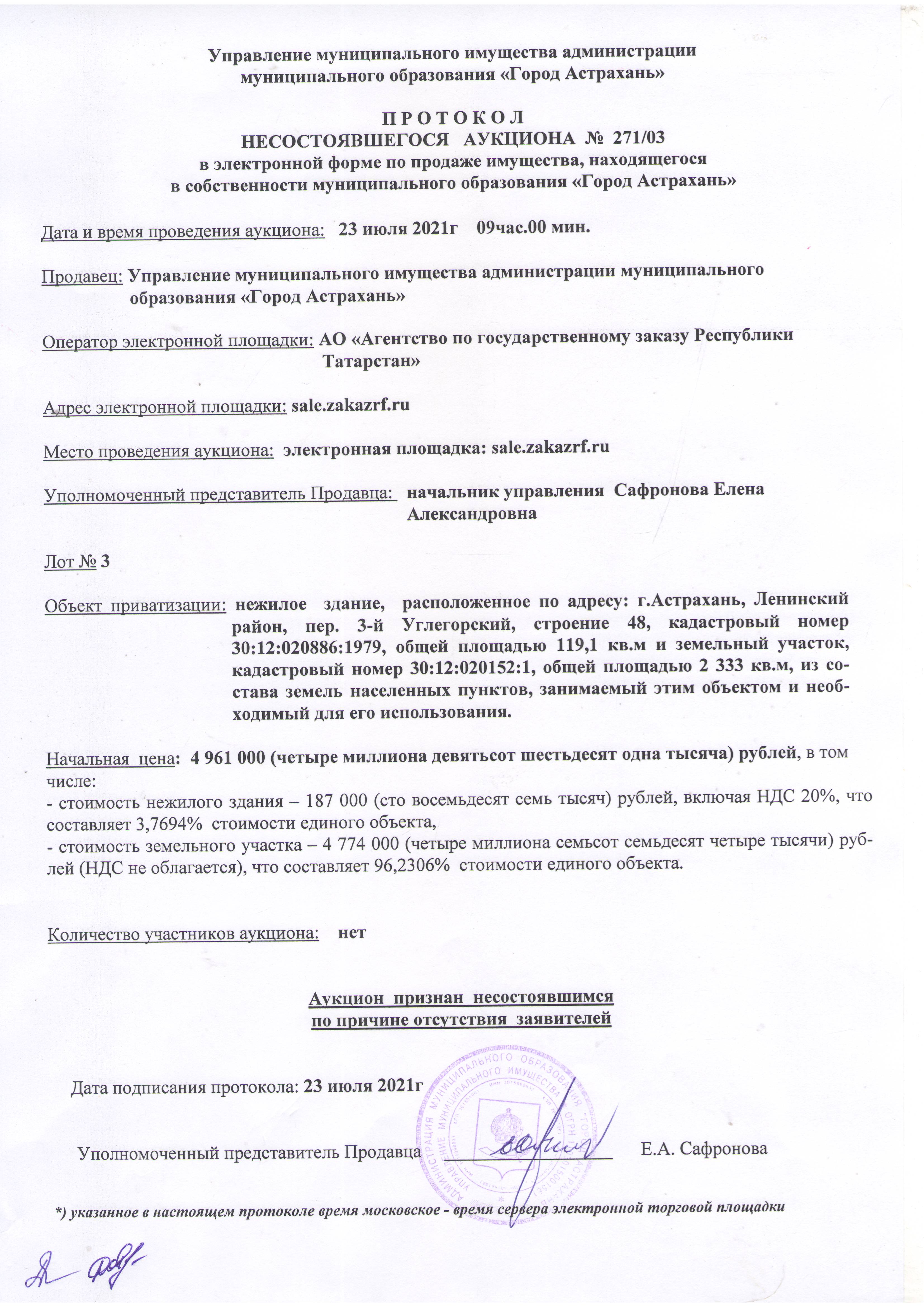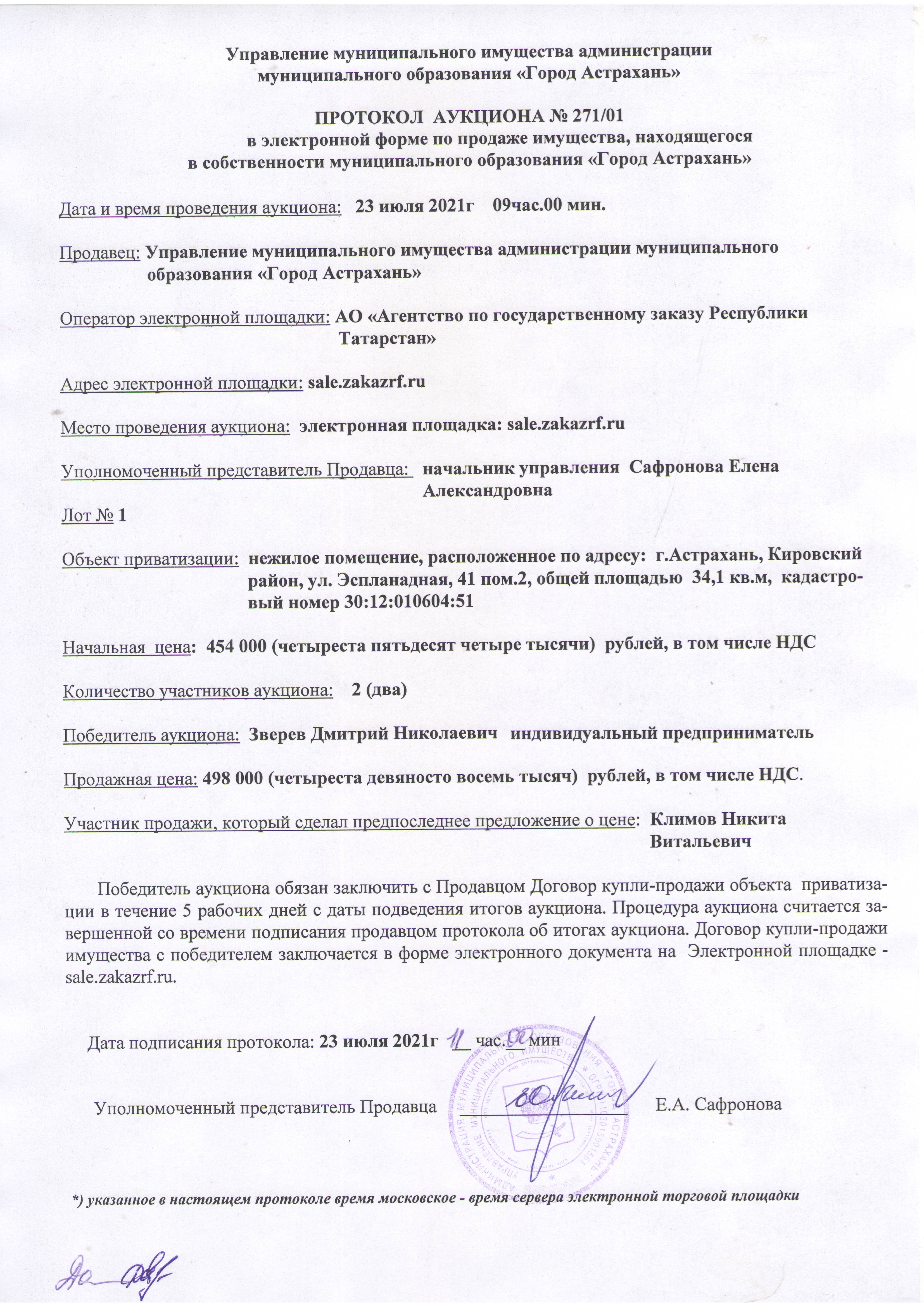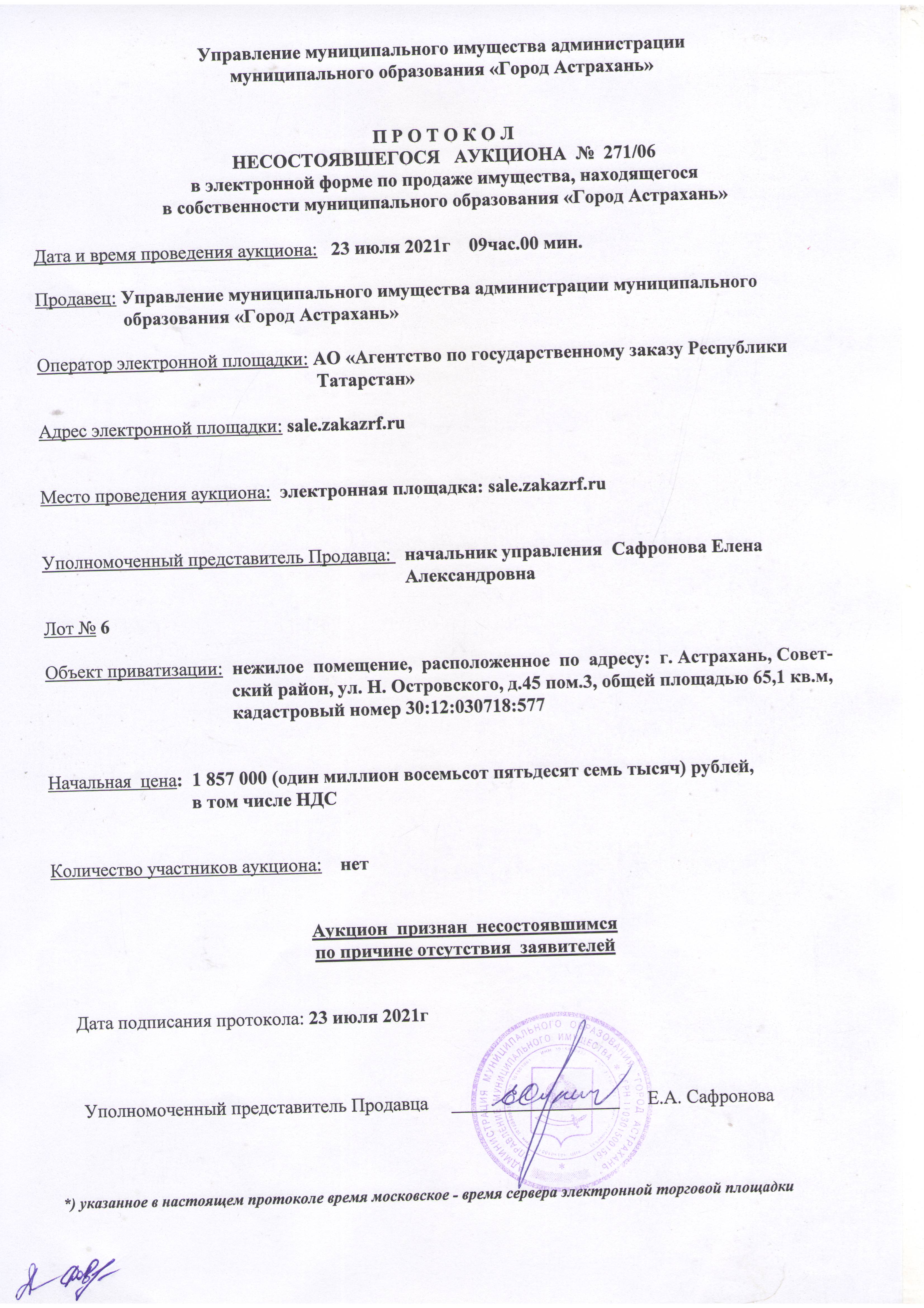 отчет об аукционе по продаже имущества, находящегося в собственности муниципального образования "Город Астрахань" 23.07.2021