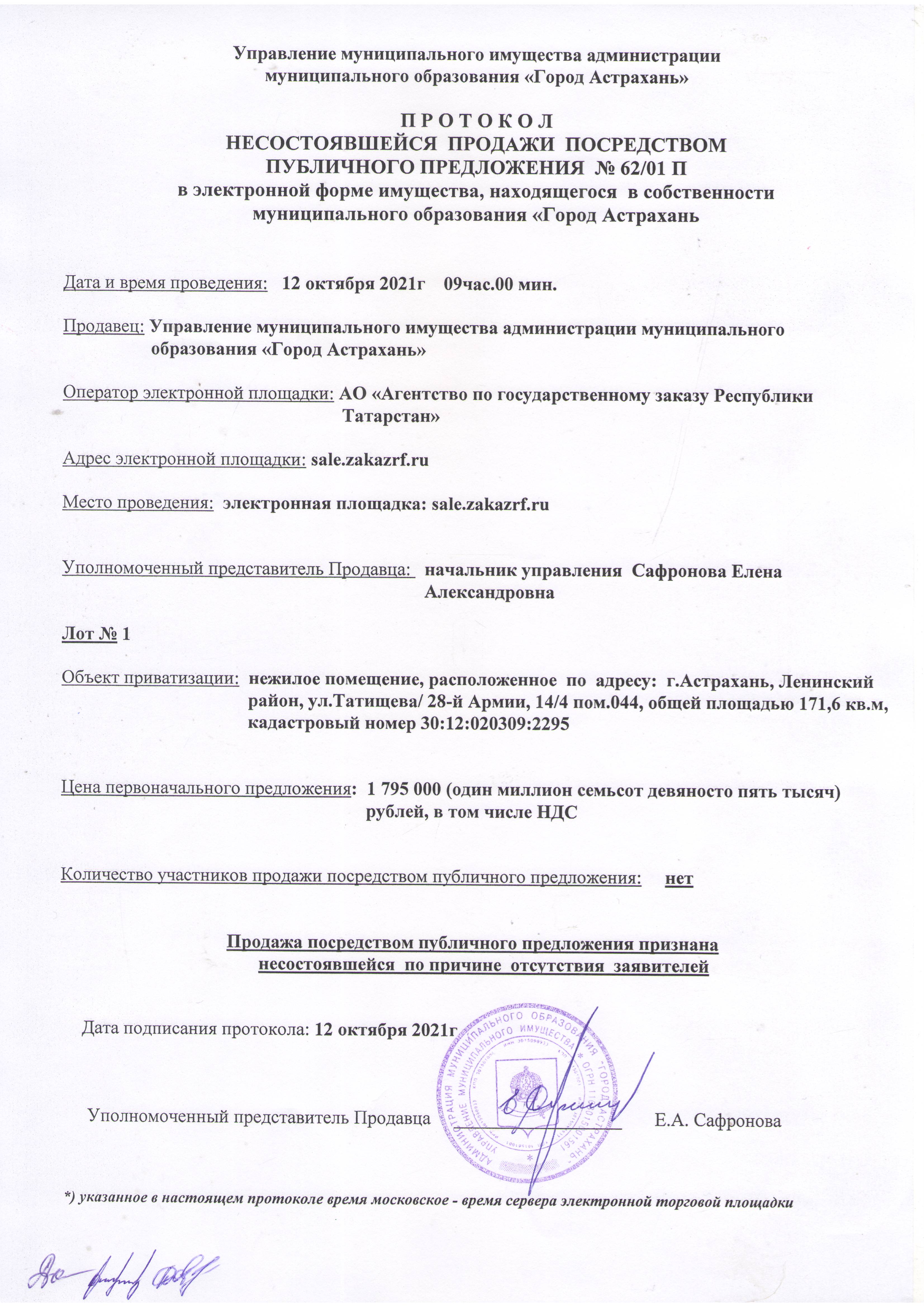 отчет по продаже имущества, находящегося в собственности муниципального образования "Город Астрахань" 12.10.2021г