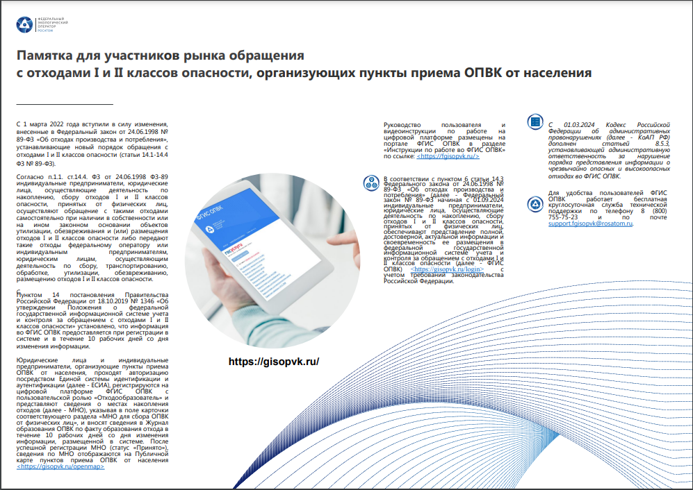 Памятка для участников рынка обращения с отходами I и II классов опасности, организующих пункты приема ОПВК от населения