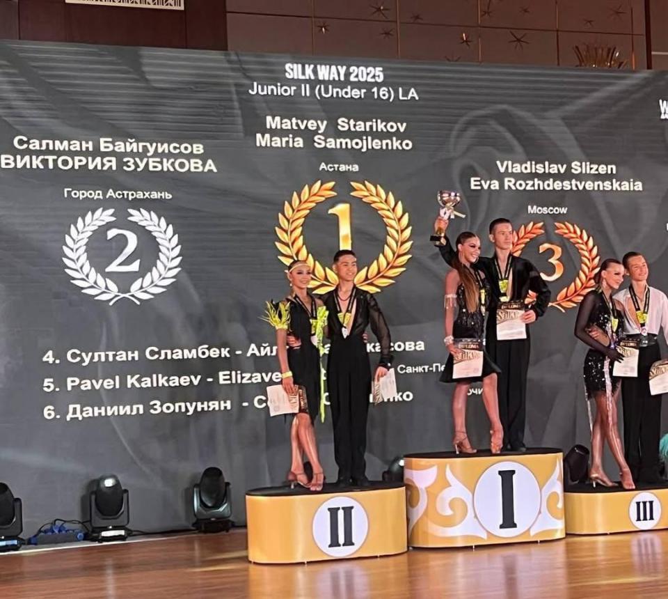 В Астане (Республика Казахстан) прошли международные соревнования по танцевальному спорту «SILK WAY 2025». В рамках состязаний разыгрывались медали шести Чемпионатов мира среди танцоров WDC AL. Воспитанники муниципального бюджетного учреждения дополнительного образования «Спортивная школа «Биг-Данс» Байгуисов Салман и Зубкова Виктория прошли в финал и стали серебряными призерами в категории Junior II Latin.