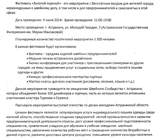 По инициативе Швейного Сообщества г.Астрахани, которое объединяет более 150 дизайнеров и портных, 9 июня 2024 года c 11:00 до 19:00 проводится Фестиваль «Золотой Портной». Это мероприятие с бесплатным входом для жителей города, неравнодушных к швейному делу, в том числе и для предпринимателей и самозанятых в этой сфере.