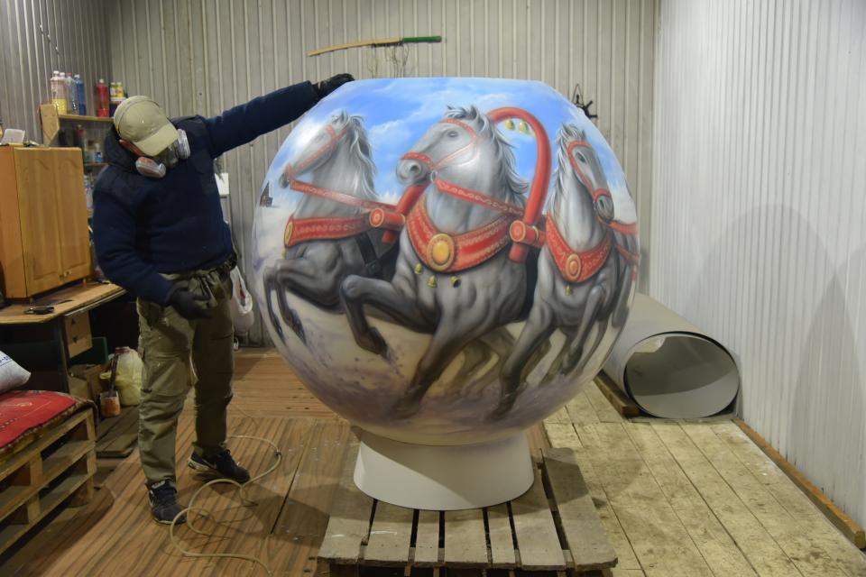 Раскрашивают сейчас и уличные вазоны по технологии аэрографии. На сюжеты художников вдохновили открытки 50-х годов прошлого века. Также из вазонов сделают трехметрового снеговика с подсветкой. Рядом с фигурами установят резную мебель – стол и скамью. Ее специально сделали низкой для детей. Место для будущей фотозоны пока не выбрано.