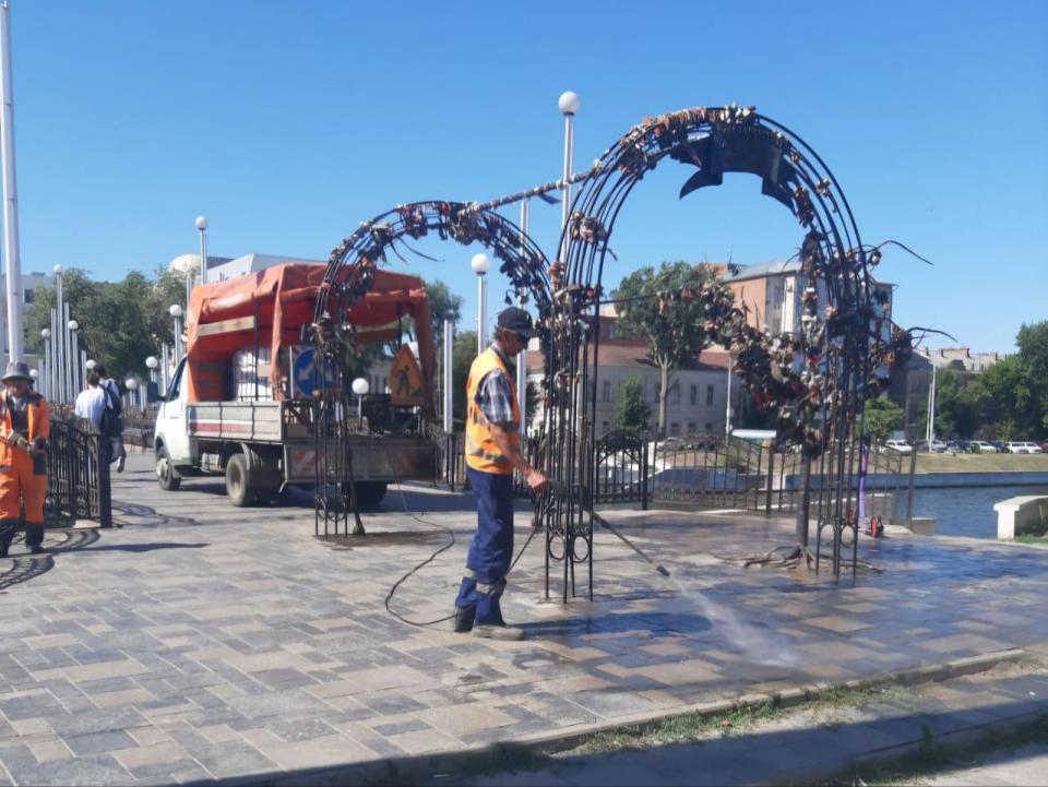 Сотрудники муниципального учреждения «Мосты и каналы» зачищали от наносного грунта прилотковую зону на мостах Милицейском, Таможенном, Победы, Калининском, Сапожниковском. Аналогичные работы проводились и на Коммерческом - здесь, как и на мосту Влюбленных, с помощью аппарата высокого давления также мыли леерное ограждение и пешеходную зону.