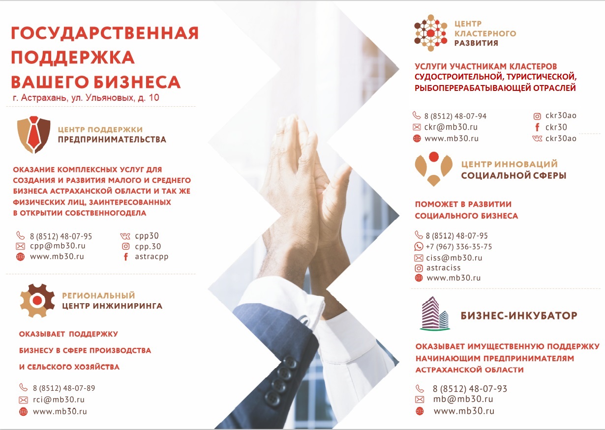 На территории Астраханской области создан и функционирует Центр «Мой бизнес», который объединяет в себе следующие объекты инфраструктуры поддержки бизнеса и виды поддержки: АО «Астраханский залоговый фонд»; Астраханский фонд поддержки малого и среднего предпринимательства (микрокредитная компания) (далее - Фонд); Центр поддержки экспорта Фонда; АУ АО «Астраханский областной инновационный центр»: Региональный центр инжиниринга; Центр кластерного развития; Центр, инноваций социальной сферы; офис «Мои Документы для бизнеса» АУ АО «Многофункциональный центр предоставления государственных и муниципальных услуг»; Центр поддержки предпринимательства; бизнес-инкубаторы, бизнес-офис и коворкинг.