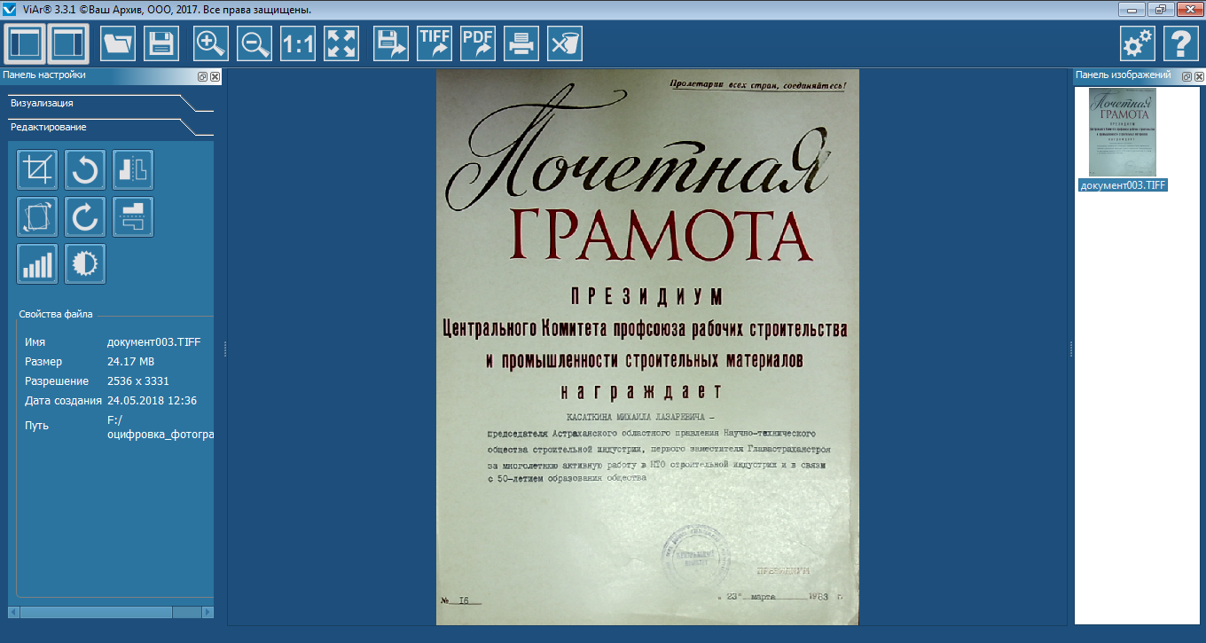 Программное обеспечение визуализатора разработано на основе рекомендаций Росархива, что с легкостью позволяет решать ежедневные задачи оцифровки документов, а также позволит решить ряд задач по созданию электронного фонда пользования:
