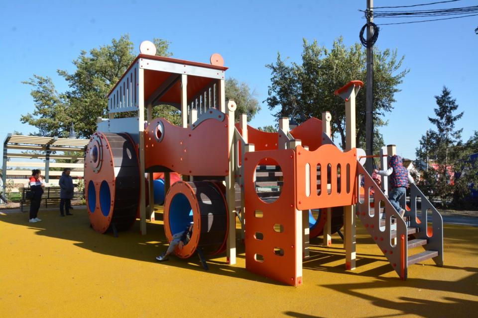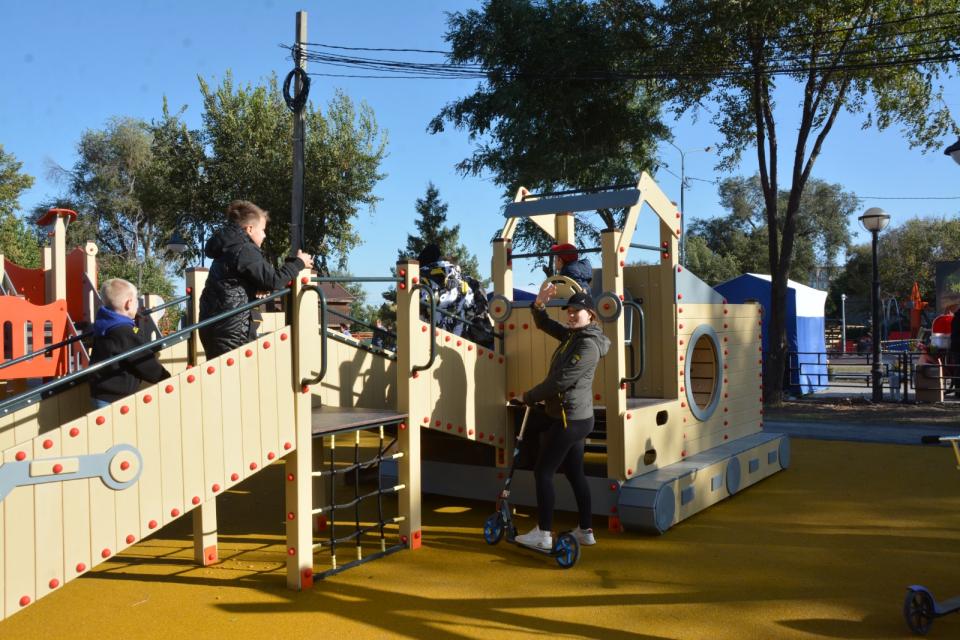 Работы проходили на площади более восьми тысяч квадратных метров. В сквере обустроены пешеходные и велодорожки, зоны отдыха со скамейками-лежаками и качелями, сцена для проведения мероприятий, установлены малые архитектурные формы и детские игровые площадки, в соответствии с названием сквера стилизованные под строительную технику.
