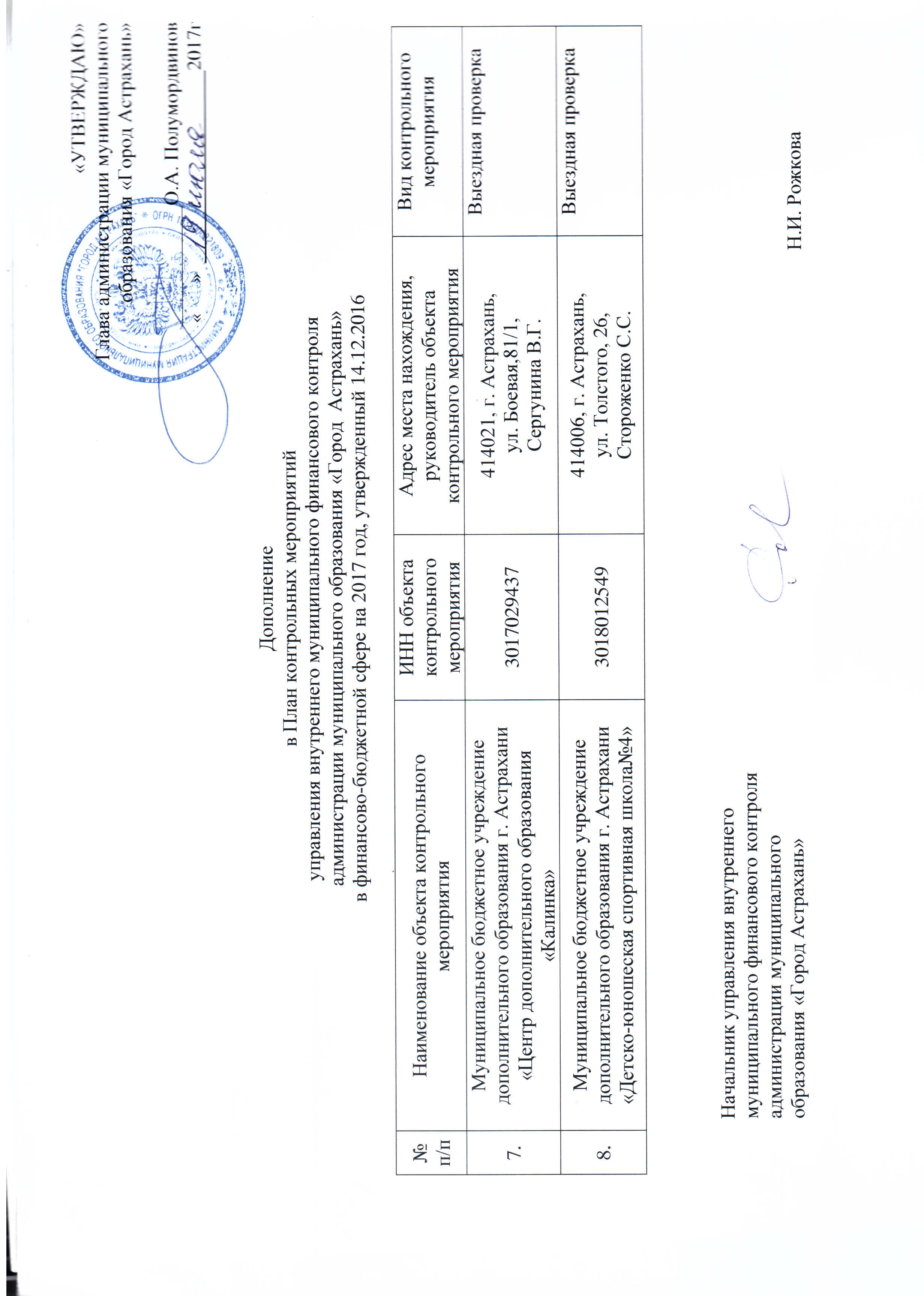 План контрольных мероприятий управления внутреннего муниципального финансового контроля администрации муниципального образования «Город Астрахань» в финансово-бюджетной сфере на 2017 год дополнен проведением проверок в муниципальных бюджетных учреждениях дополнительного образования города Астрахани: «Центр дополнительного образования «Калинка» и «Детско-юношеская спортивная школа №4».