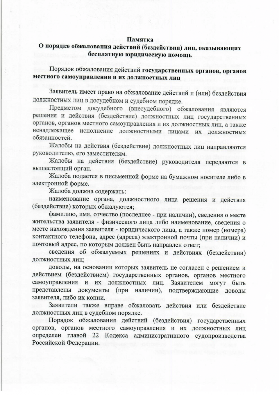 Памятка о порядке обжалования действий (бездействия) лиц, оказывающих бесплатную юридическую помощь