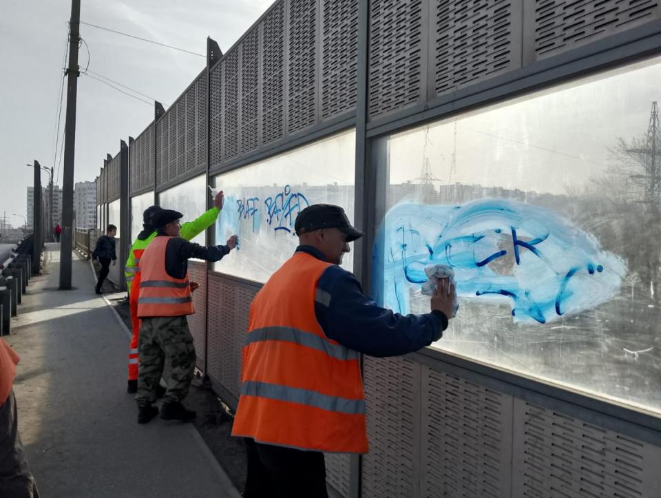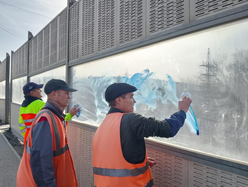 Помытые на прошлой неделе шумозащитные экраны вокзального путепровода снова изрисованы вандалами. В конце прошлой недели сотрудники предприятия «Мосты и каналы» отмыли надписи с 60 секций из 80. Вчера планировали завершить работу. Но на выходных на уже зачищенных ограждениях появились новые рисунки и специалистам пришлось оттирать их.
