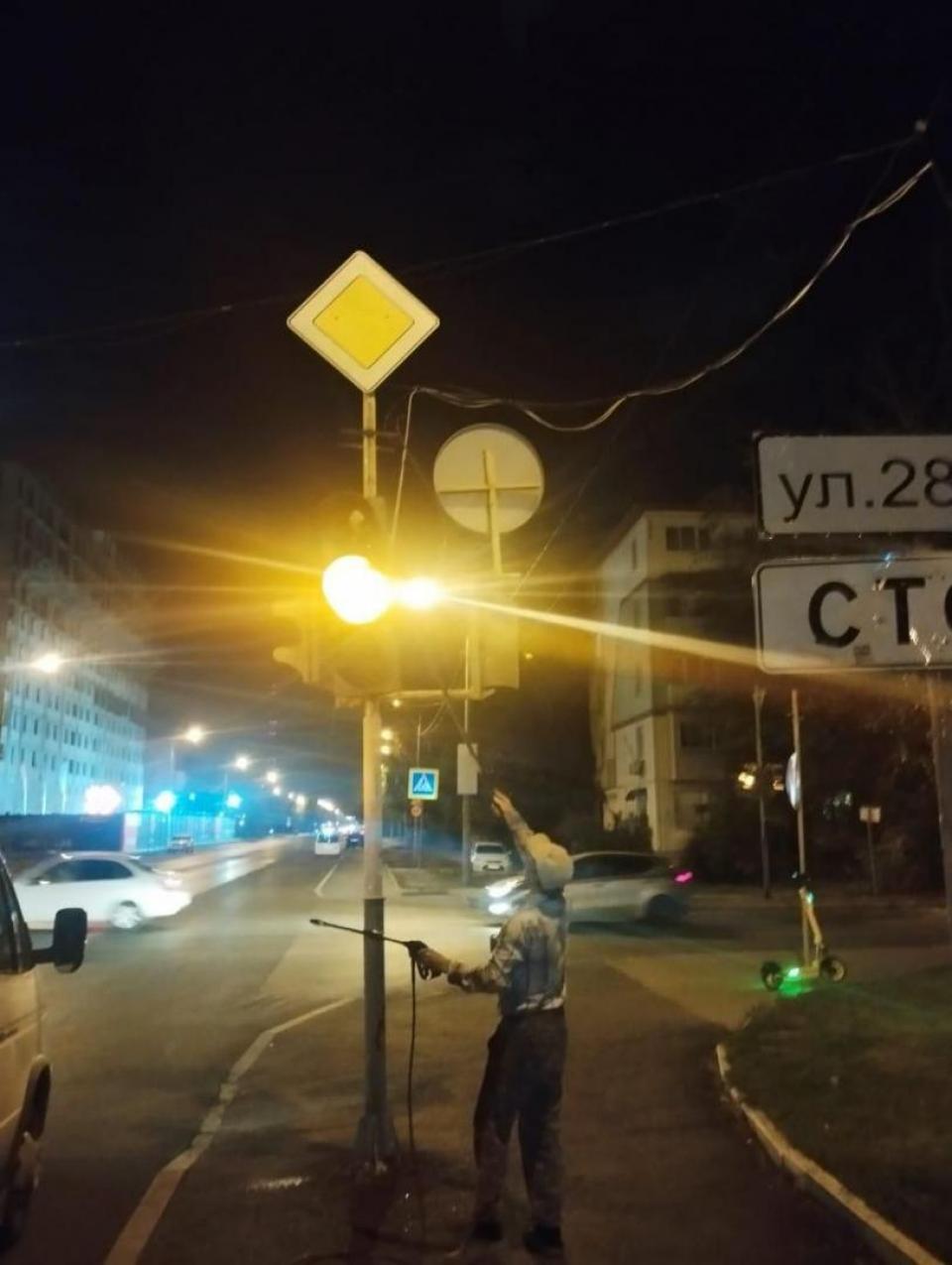 К настоящему времени помыты почти тысяча дорожных знаков и свыше 130 светофоров на магистральных улицах и не только. Работы проводят ночью, чтобы не мешать автотранспорту.