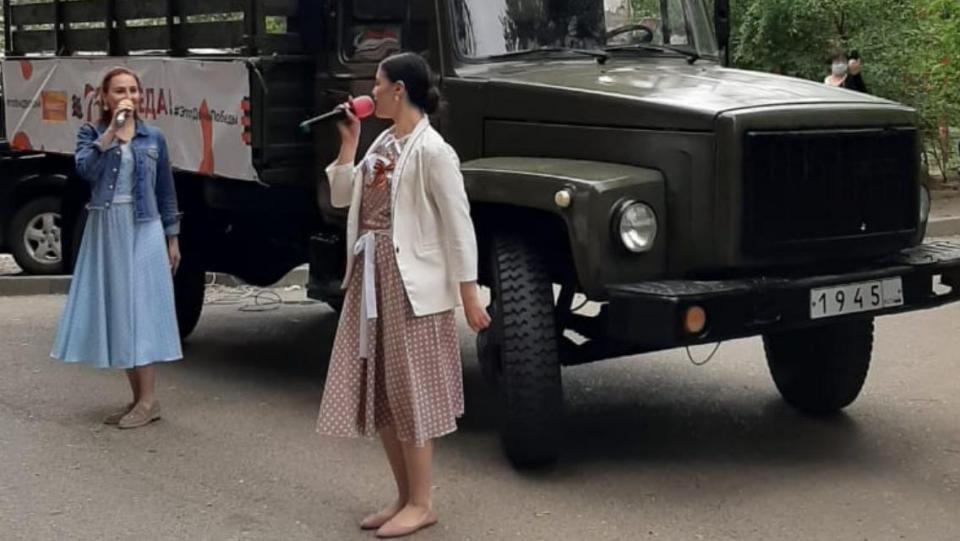 В связи с ограничительными мерами мероприятия праздника проходят в новых условиях. Для того чтобы создать атмосферу праздника для астраханцев, была создана группа местных артистов - «фронтовая бригада». В рамках акций «Театрализованное поздравление» и «Поем двором» они объезжают городские дворы, в частности, по улицам Водников, Дзержинского, Сен-Симона, Набережная Приволжского затона, пл. Заводская и пер. Грановский. Адреса были выбраны, исходя из мест проживания ветеранов и удобного расположения для просмотра концерта из дома. Артисты демонстрируют вокальные, театральные и поэтические номера патриотической тематики – военные песни, стихи, сценки фронтовой жизни и отрывки театральных постановок по мотивам известных произведений. В качестве сцены выступает стилизованная «полуторка» - автомобиль ГАЗ, который в годы войны не только снабжал передовую продовольствием, но и помогал в перевозке артистов на фронт.