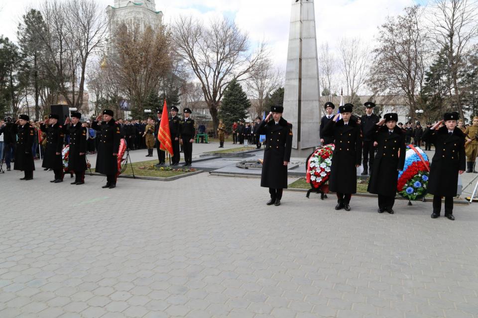 Участники митинга минутой молчания почтили память погибших и возложили венки и цветы к Вечному огню.