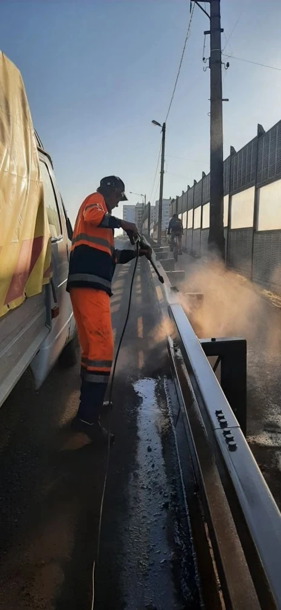 Бригады МБУ «Мосты и каналы» работали на мосту в створе ул. Победы. Красили ограждение, которое предварительно очистили от грязи и пыли. На обновление покрытия элементов коммунальщикам потребуется несколько дней. На путепроводе Вокзальном и мосту через р. Кривая Болда мыли шумовые экраны.