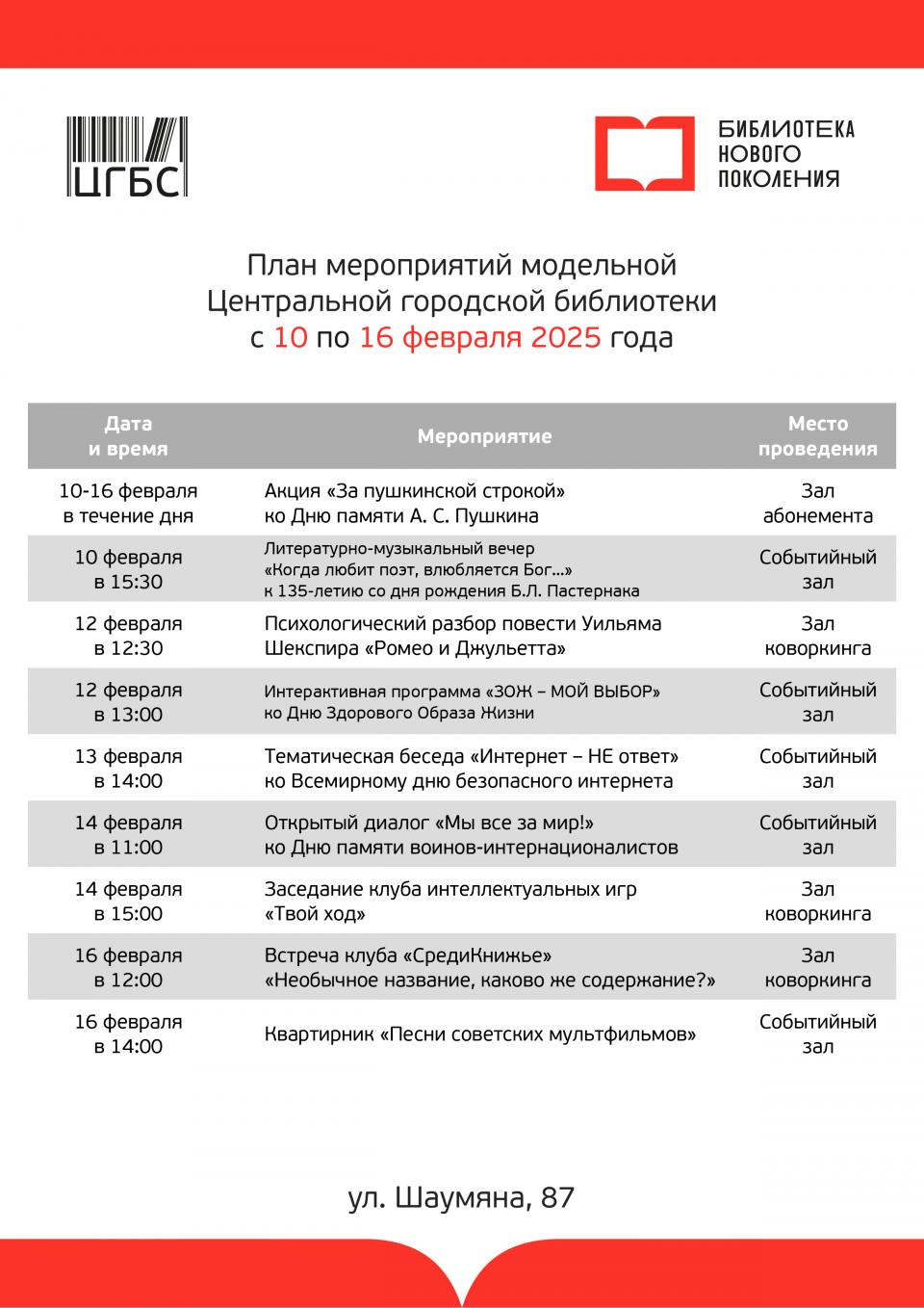 Проект «Квартирник на Шаумяна» стартовал летом 2024 года и проходит каждый месяц. Вход всегда неизменно свободный и бесплатный. Впрочем, это только одно из мероприятий, которые запланированы в модельной библиотеке на следующую неделю. Так, 10 февраля в 15:30 будет организован литературно-музыкальный вечер к 135-летию со дня рождения поэта и писателя Б.Л. Пастернака, а 14 февраля в 15.00 состоится заседание клуба интеллектуальных игр.