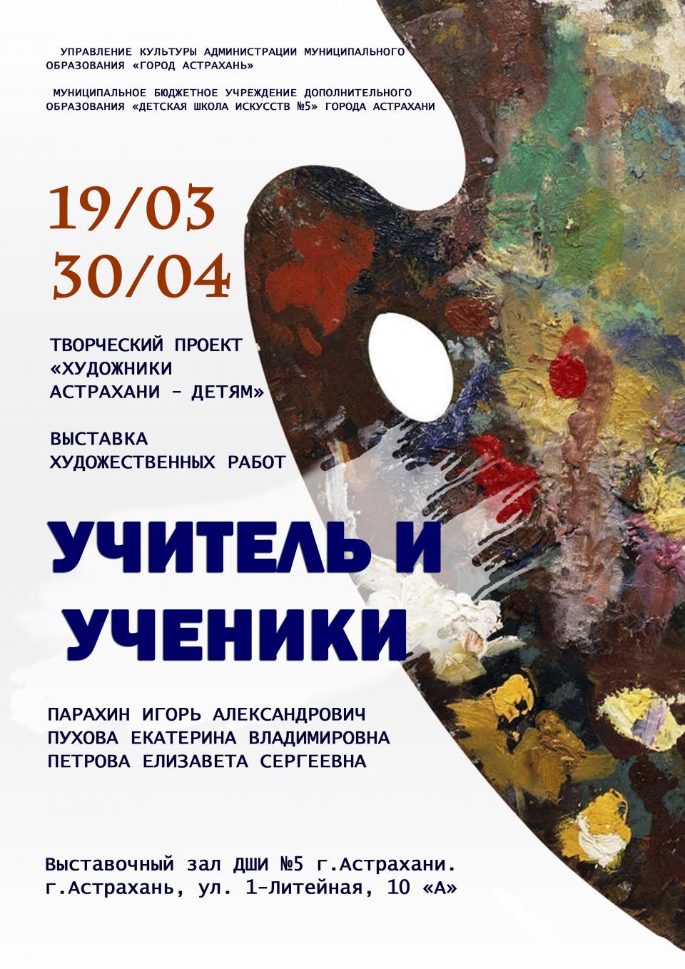 19 марта в рамках городского творческого проекта «Художники Астрахани – детям» в выставочном зале астраханской детской школы искусств № 5 состоится открытие выставки «Учитель и ученики».