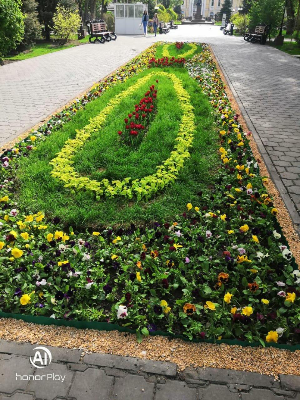 В Братском саду также появилась объемная цветочная композиция в виде шара, посвященная Великой Отечественной войне. Подобные конструкции радуют горожан и на бульваре Победы. Здесь же высадили клумбу из красных сальвий в форме звезды.