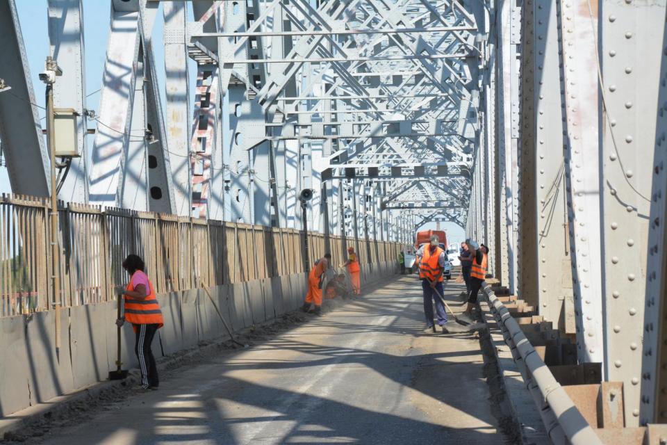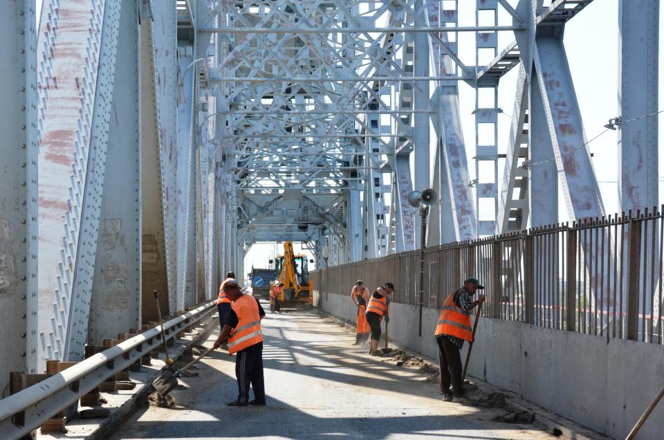 Сегодня большая уборка прошла на Старом мосту. Было задействовано 15 дорожных рабочих МБУ «Мосты и каналы» и 7 единиц техники: погрузчики, самосвалы, помывочные машины. На время проведения работ было организовано реверсивное движение. «В прошлую субботу убирали часть моста, которая ведет в сторону Трусовского района, сегодня – противоположную полосу, — рассказал директор муниципального учреждения Евгений Шведов. — За шесть часов работы в каждом направлении с прилотковой части моста поднимаем 40-45 кубометров наносного грунта. Это достаточно большой объем: порядка 12 самосвалов».