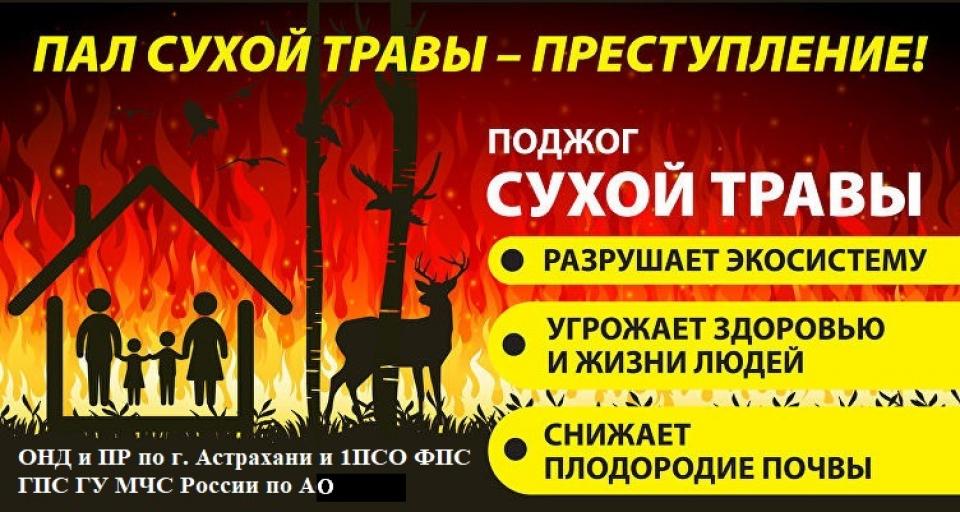 Отдел надзорной деятельности и профилактической работы по городу Астрахани совместно с 1 ПСО ФПС ГПС ГУ МЧС России по АО сообщает, что сжигать сухую траву и мусор опасно. От небольшого костра могут загореться строения, надворные постройки, индивидуальный транспорт граждан.