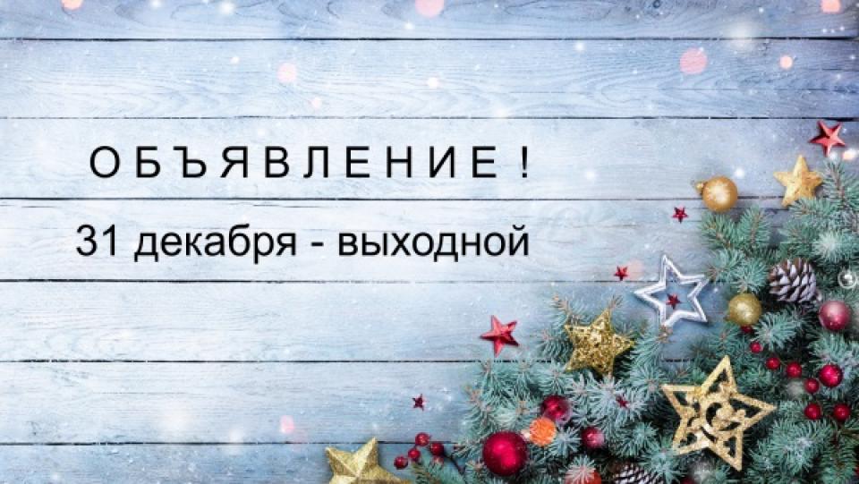 Руководствуясь распоряжением губернатора Астраханской области от 24.12.2020 №722-р «О некоторых мерах по организации в Астраханской области рабочего времени в декабре 2020 года», рабочий день 31.12.2020 перенесён на 26.12.2020.