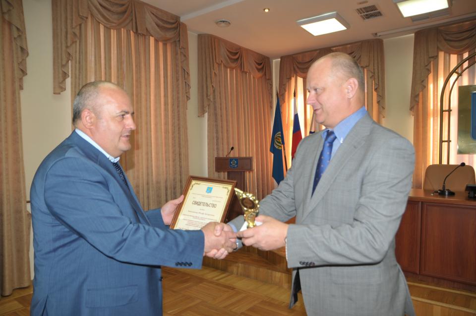 Глава администрации города Олег Полумордвинов вручил награду генеральному директору ООО «АстДомСтрой-Инвест» Юсуфу Зейнединову.