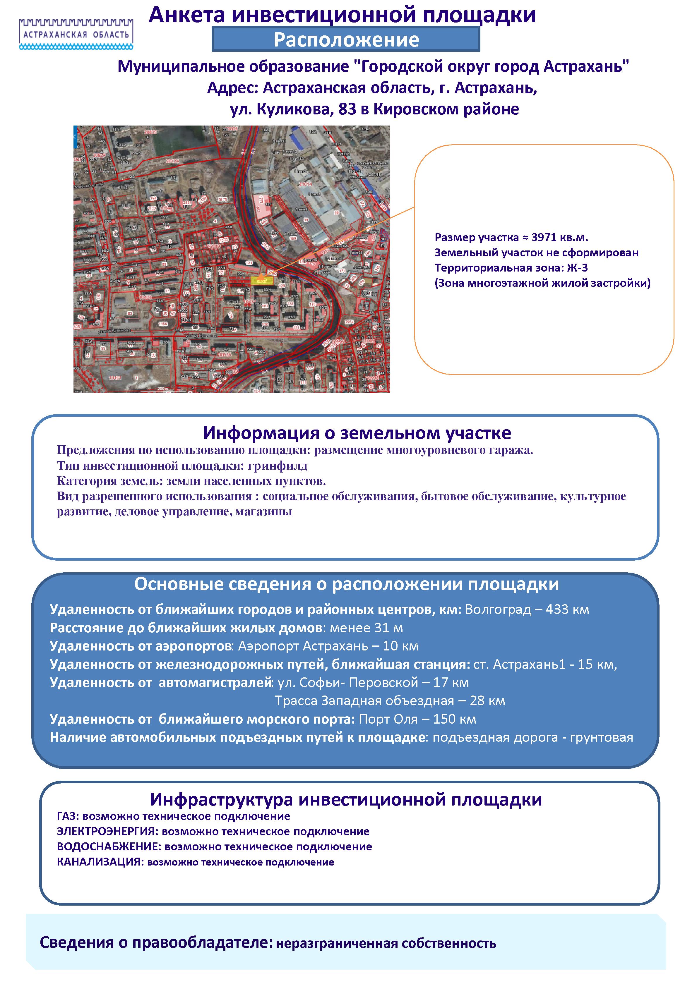 Анкета инвестиционной площадки Астраханская область, г. Астрахань, ул. Куликова, 83 в Кировском районе