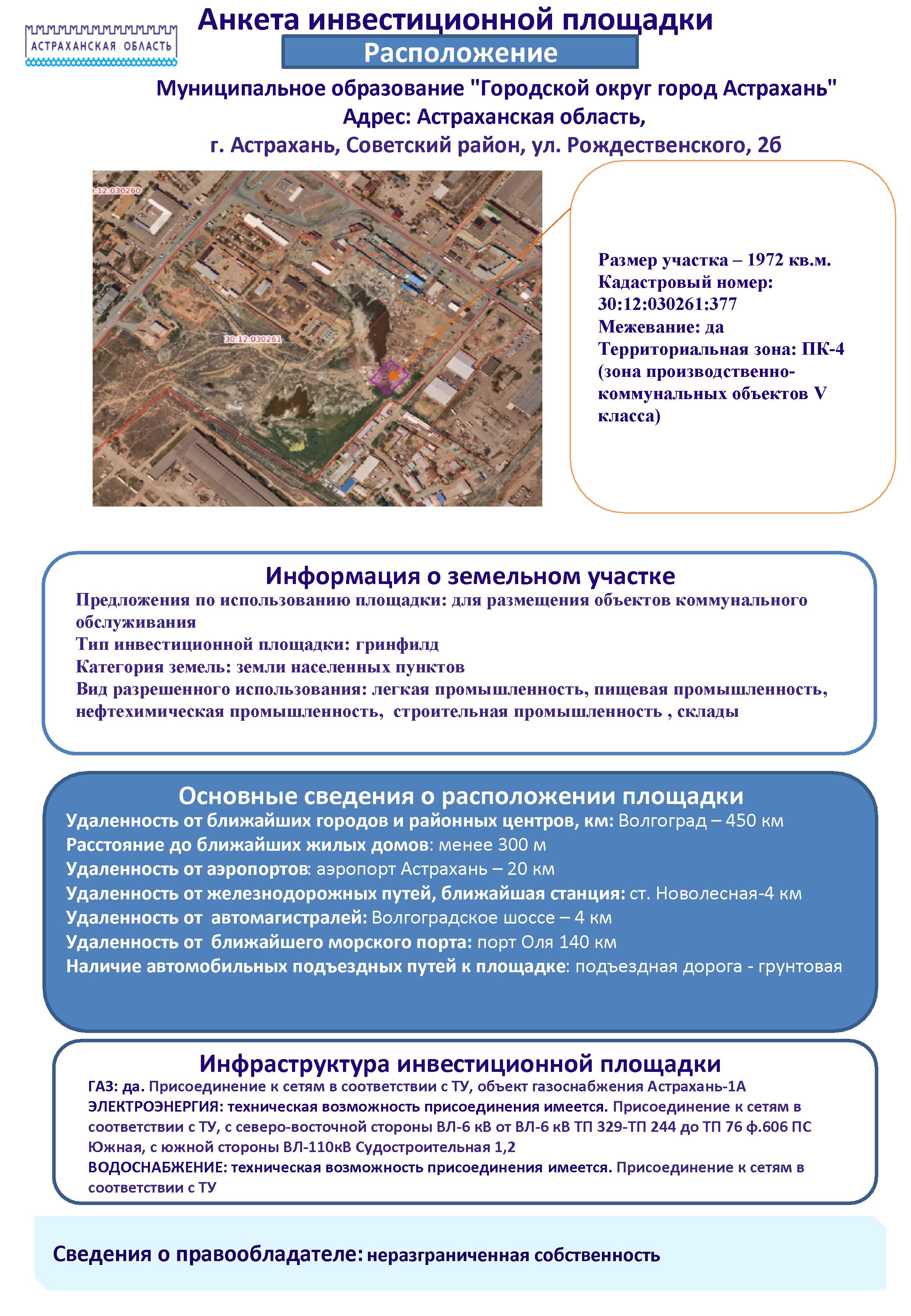 - Анкета инвестиционной площадки Астраханская область, г. Астрахань, ул. Рождественского, 2б в Советском районе