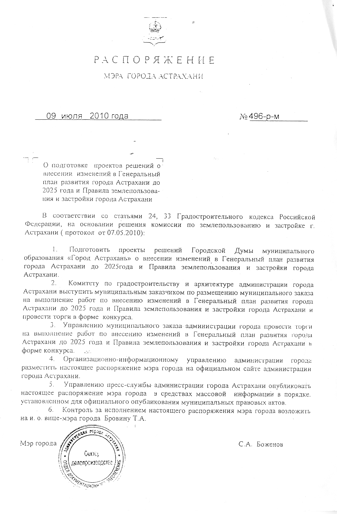 Распоряжение мэра города Астрахани от 09.07.2010 № 496-р-м «О подготовке проектов решений о внесении изменений в Генеральный план развития города Астрахани до 2025 года и Правила земплепользования и застройки города Астрахани» |