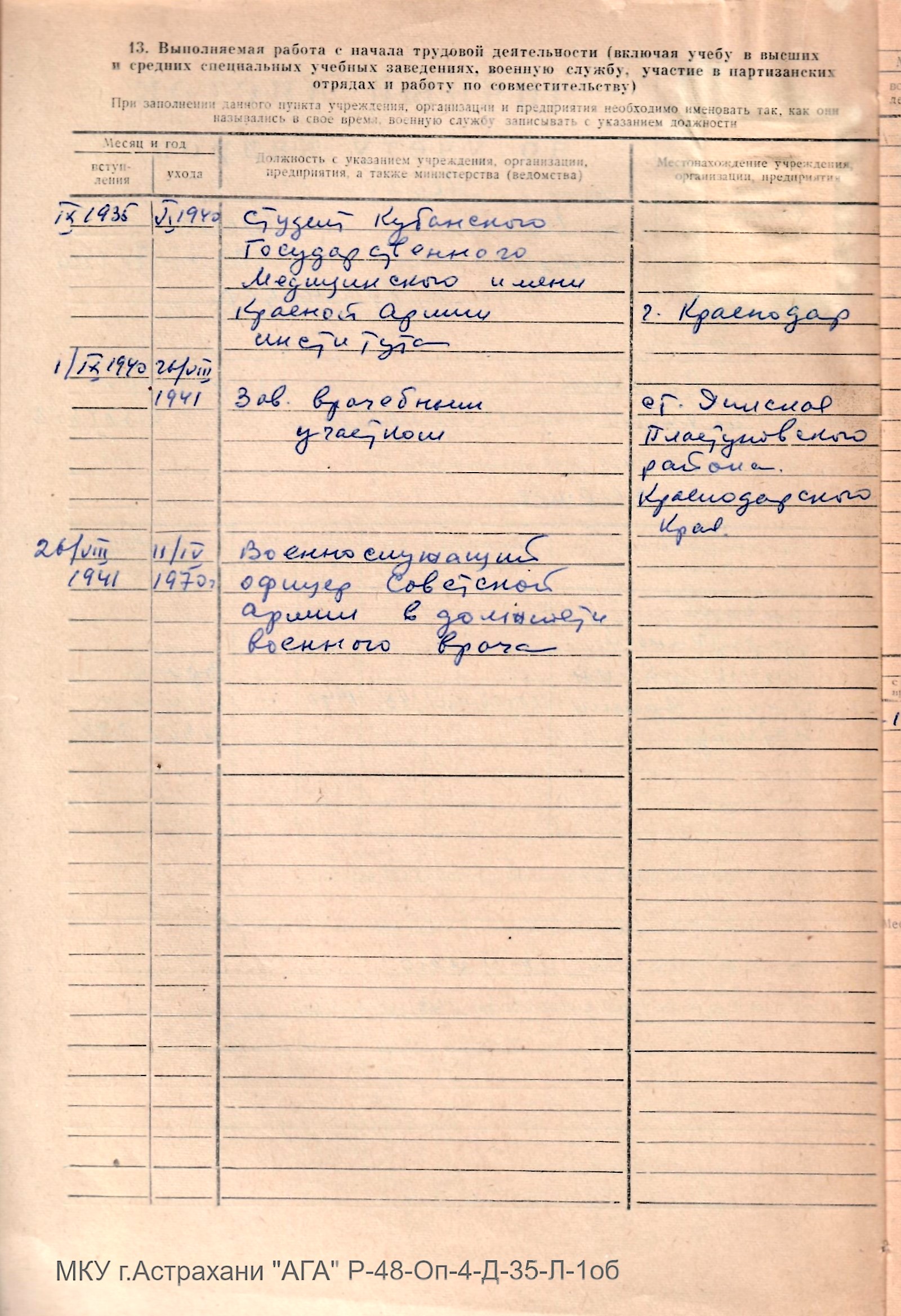 В период с августа 1934 года по июнь 1941года работал главным врачом больницы им.Кирова в Астрахани.