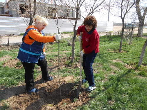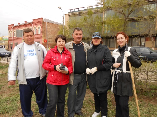 Фотография. Субботник в сквере имени Ф.Э. Дзержинского. Сотрудники администрации Трусовского района и МКУ г.Астрахани «АГА». Слева направо: начальник коммунального отдела района Суйналиев М.М., главный инженер-начальник отдела эксплуатации здания Бабарыкина Н.В., 1-ый заместитель главы администрации района Усманов А.Х., директор МКУ г.Астрахани «АГА» Леонтьева Н.А., секретарь директора архива Андреева Ю.В. 2013 год.