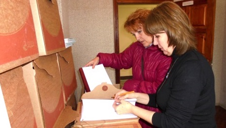 Слева сотрудник ГКУ АО «ГААО» Муртазаева З.Е. сдает, архивариус МКУ г.Астрахани «АГА» Ломонина Е.Е. принимает. 2012 год.