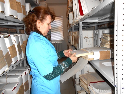 Фотография. Архивариус Ткачева Н.С. за работой в архивохранилище №1. 2012 год.
