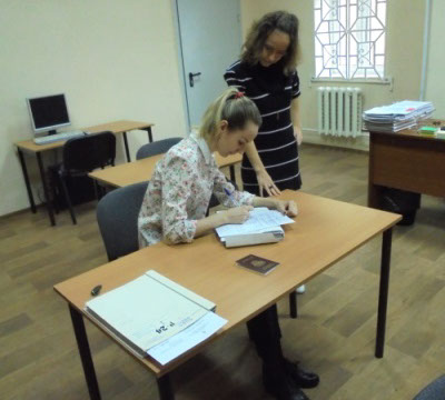 Фотография. Старший делопроизводитель Сапарова И.Н. консультирует пользователя в читальном зале городского архива (каб.61-63). 2014 год.