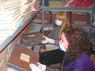 Фотография. Сотрудники архивного отдела Ткачёва Н.С. и Кондранина Т.А. в архиве МУП г.Астрахани «Астркоммунэнерго» готовят документы к приёму на хранение. 2011 год.