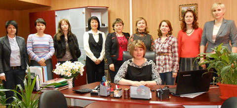 В центре директор Леонтьева Н.А.; слева направо архивариус Беляева Е.С., главный инженер-начальник отдела эксплуатации здания Бабарыкина Н.В., ведущий юрисконсульт Элиас Е.В., заместитель директора-начальник архивного отдела Тукесова В.В., ведущий документовед Мамонтова И.О., документовед Бортник А.В., старший делопроизводитель Сапарова И.Н., секретарь руководителя Андреева Ю.В., архивариус Черник М.В. 2013 год.
